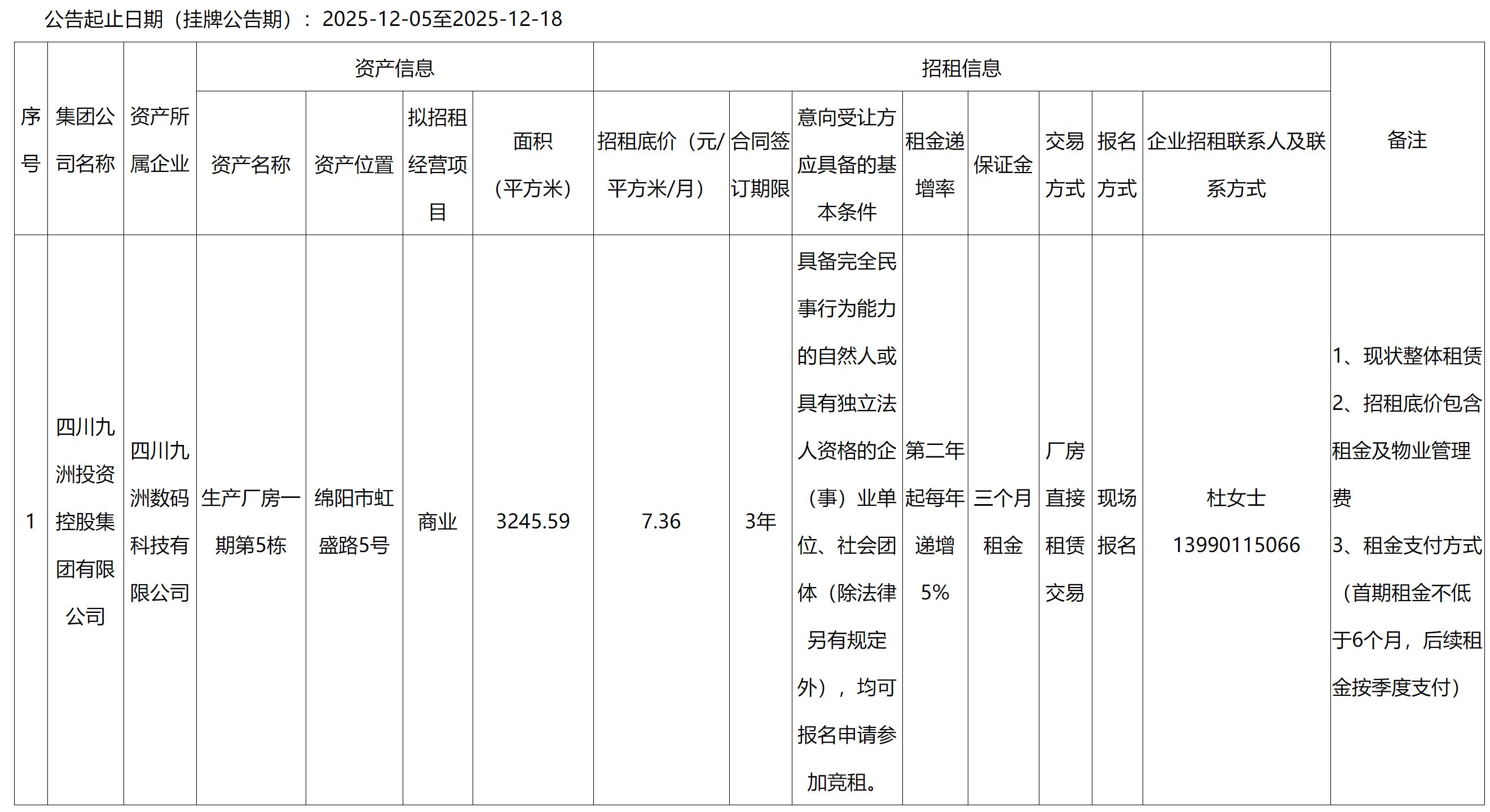 四川九洲千城商業(yè)管理有限公司園區(qū)項(xiàng)目部數(shù)碼工業(yè)園廠房出租公告
