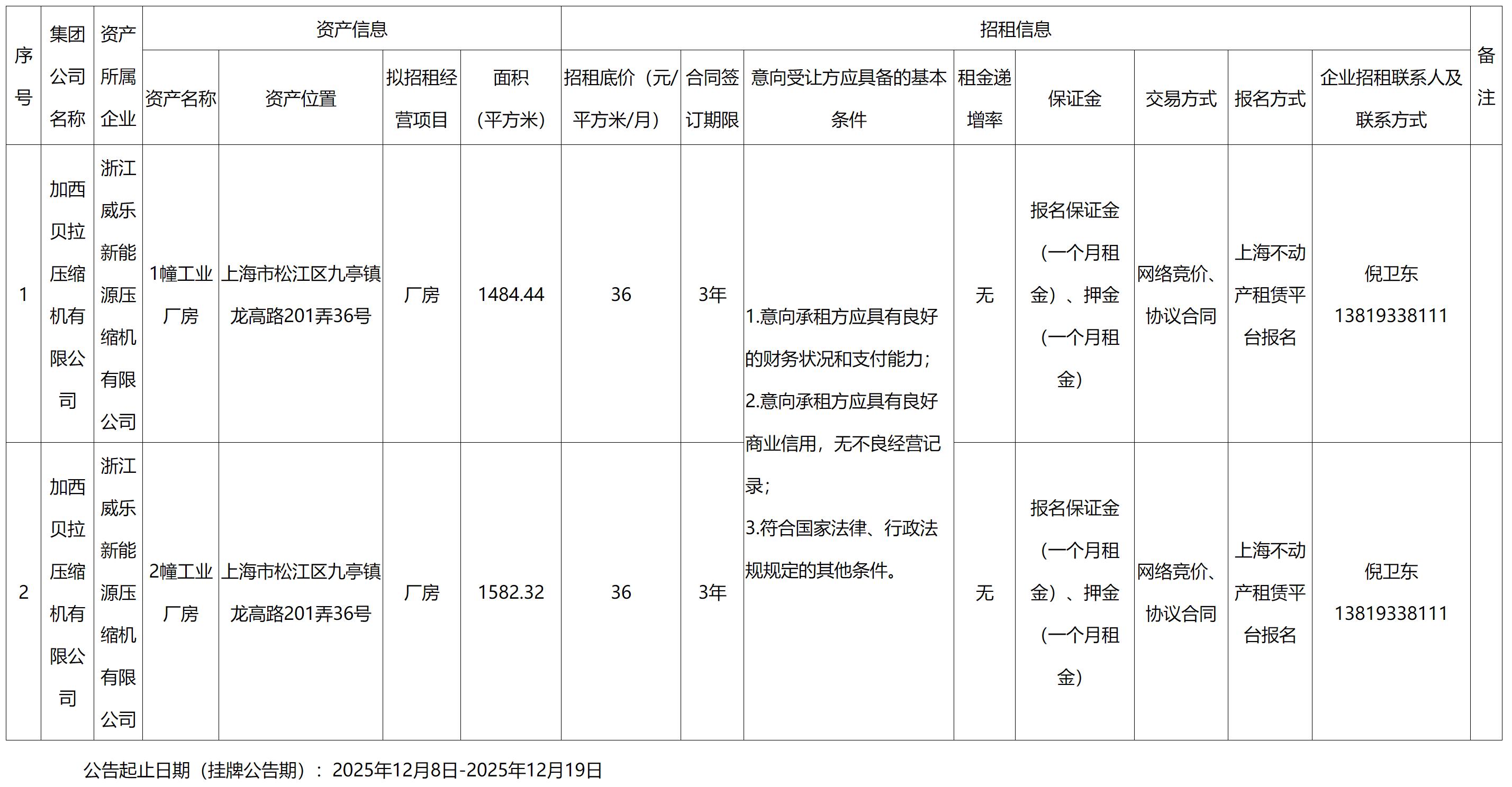 浙江威樂新能源壓縮機有限公司企業(yè)資產(chǎn)出租公告