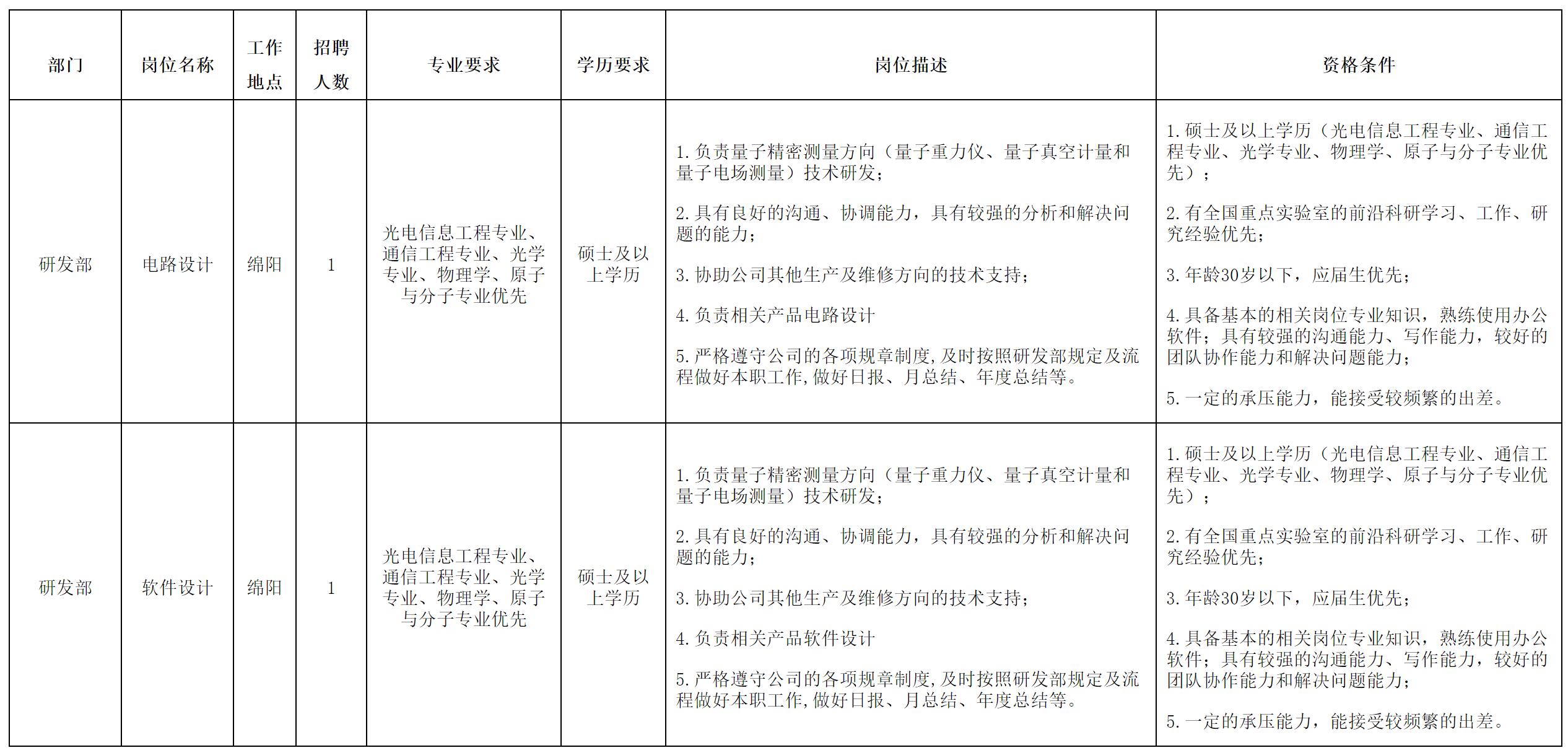 四川長虹電子科技有限公司(國營第七八〇廠)始建于1958年,是國家“一五”期間的156個重點項目之一,是我國第一個機(jī)載火控雷達(dá)科研生產(chǎn)基地,位于綿陽市經(jīng)濟(jì)技術(shù)開發(fā)區(qū)。公司注冊資本1.7億元人民幣,為國有獨資企業(yè)。公司以高端光電儀器和高端光電裝備為主線,主要從事重力測量、光電探測和光電告警領(lǐng)域產(chǎn)品研發(fā)和生產(chǎn)。因業(yè)務(wù)發(fā)展需要,現(xiàn)誠聘英才,招聘崗位及要求如下:
