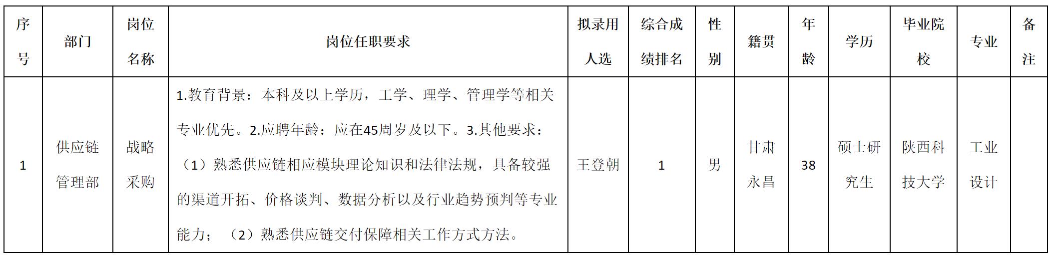 根據(jù)四川九州電子科技股份有限公司發(fā)布的招聘公告及招聘相關(guān)規(guī)定,經(jīng)測試、考察、體檢等程序,擬錄用王登朝同志到四川九州電子科技股份有限公司工作,現(xiàn)予以公示,具體情況如下: