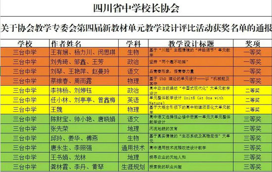 綿陽(yáng)新聞網(wǎng)訊 近日,三臺(tái)中學(xué)教師在四川省中學(xué)校長(zhǎng)協(xié)會(huì)教學(xué)專委會(huì)第四屆新教材單元教學(xué)設(shè)計(jì)評(píng)比活動(dòng)榮獲四個(gè)一等獎(jiǎng)、三個(gè)二等獎(jiǎng)!