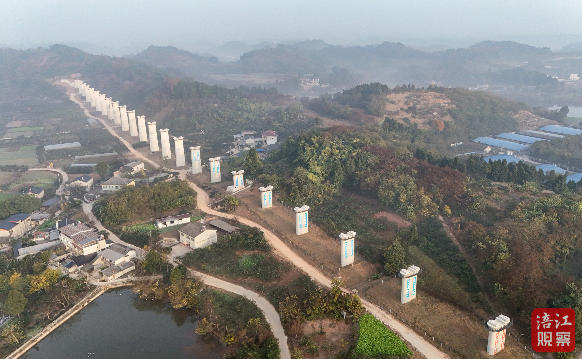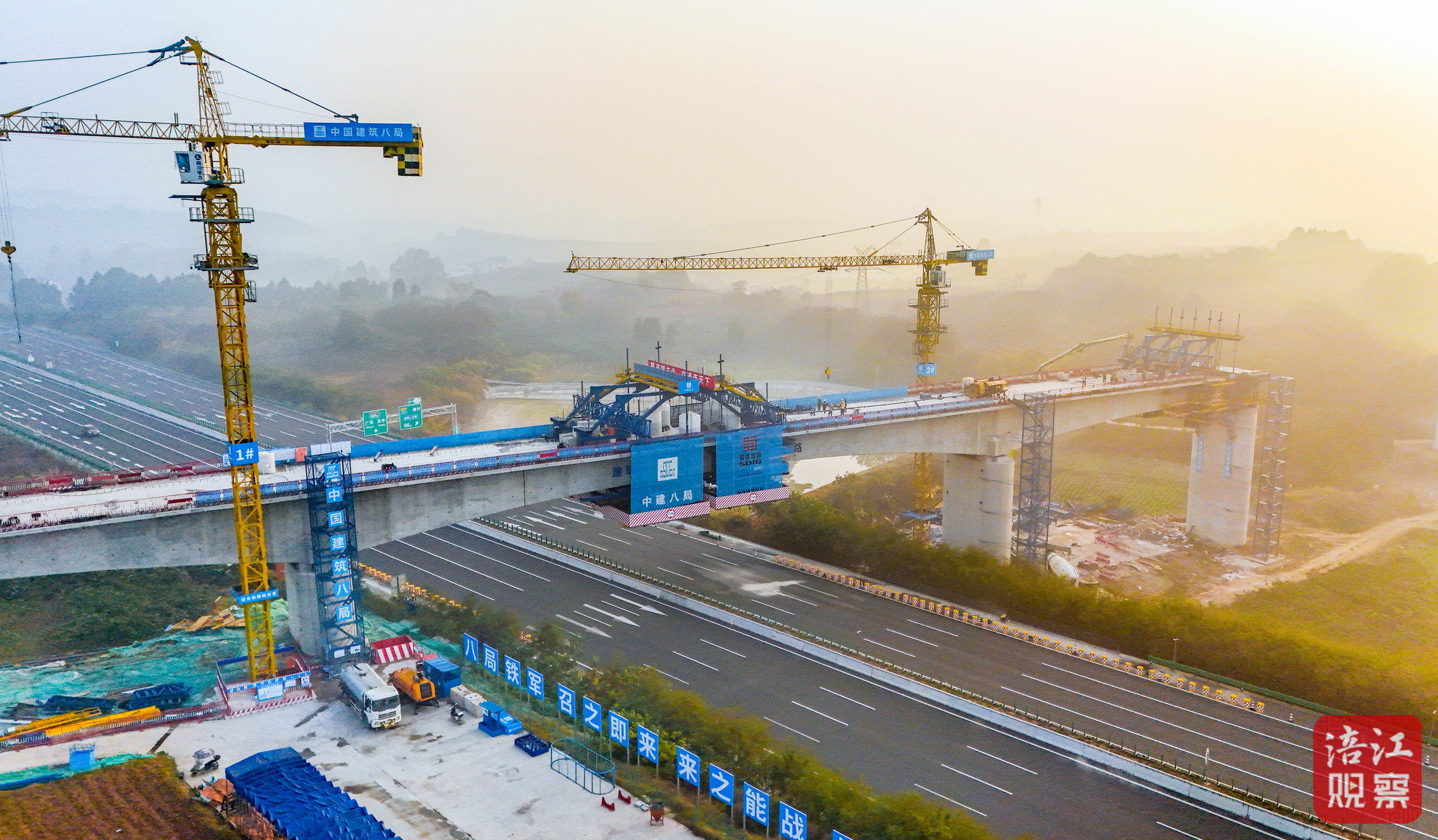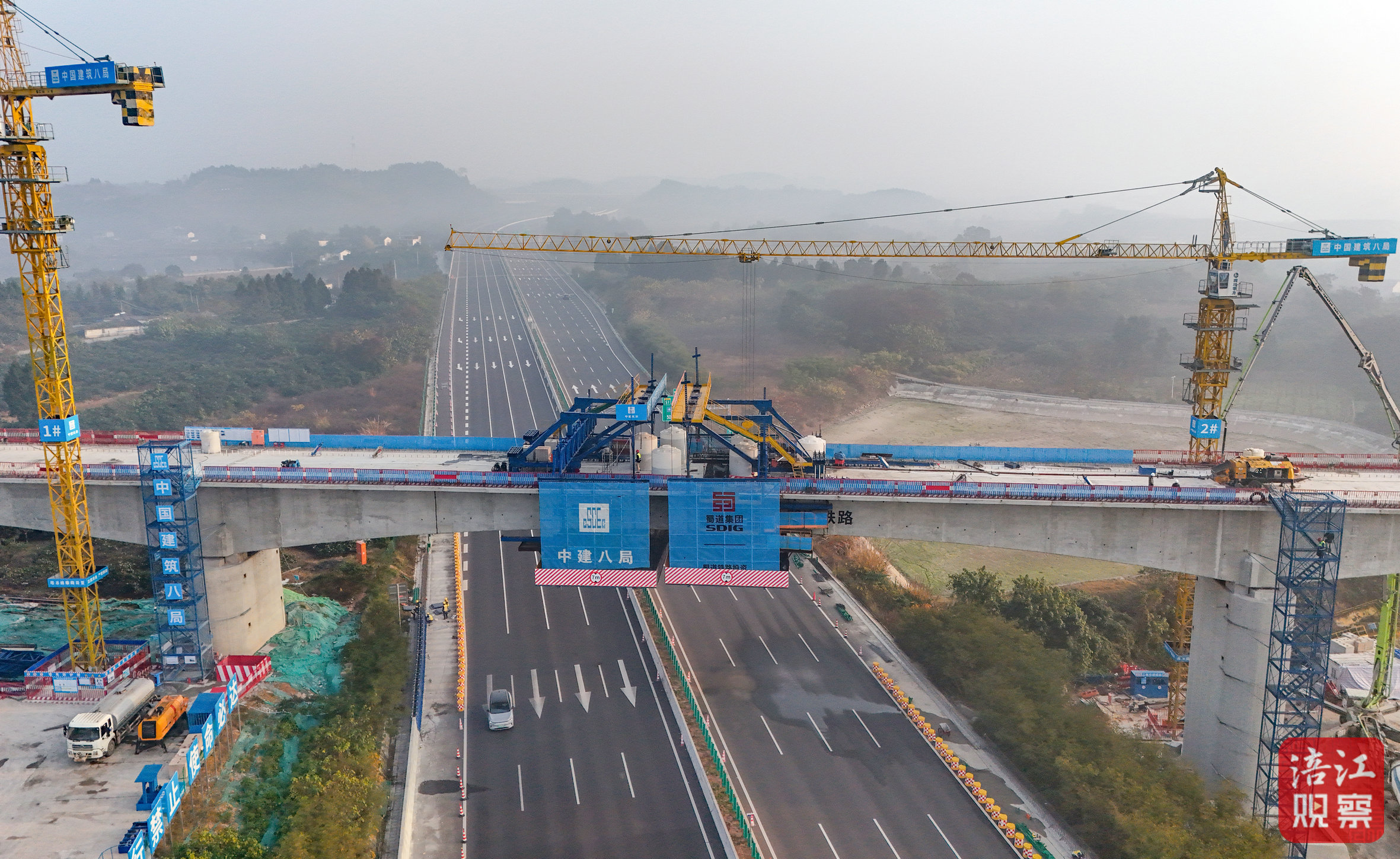 在陽(yáng)光映照下,這座以75度夾角凌空跨越漢蓉高速公路的“鋼鐵長(zhǎng)虹”圓滿接駁,下方高速公路車(chē)流如織,施工區(qū)域全封閉的菱形掛籃如一道堅(jiān)固屏障,守護(hù)著“橋上施工、橋下行車(chē)”的并行安全。這標(biāo)志著全線首座跨高速公路連續(xù)梁成功貫通,項(xiàng)目建設(shè)取得重大階段性進(jìn)展。