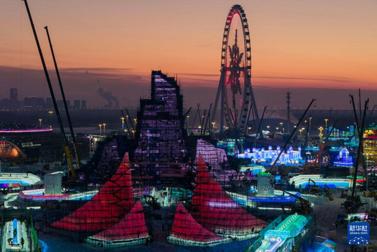 這是12月10日拍攝的哈爾濱冰雪大世界主塔施工現(xiàn)場(無人機照片)。