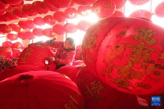 12月10日,工人在河北省石家莊市藁城區(qū)屯頭村一家宮燈廠制作宮燈。