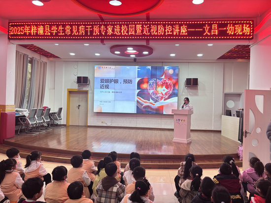 綿陽(yáng)新聞網(wǎng)訊 為了有效預(yù)防近視低齡化,普及科學(xué)用眼知識(shí),幫助幼兒樹(shù)立愛(ài)眼護(hù)眼意識(shí),養(yǎng)成良好用眼習(xí)慣。2025年12月9日,梓潼縣疾病預(yù)防控制中心、縣人民醫(yī)院聯(lián)合專家組走進(jìn)文昌一幼,開(kāi)展了以“引專家智慧·筑護(hù)眼防線”為主題的學(xué)生常見(jiàn)病干預(yù)專家進(jìn)校園暨幼兒近視防控講座活動(dòng)。