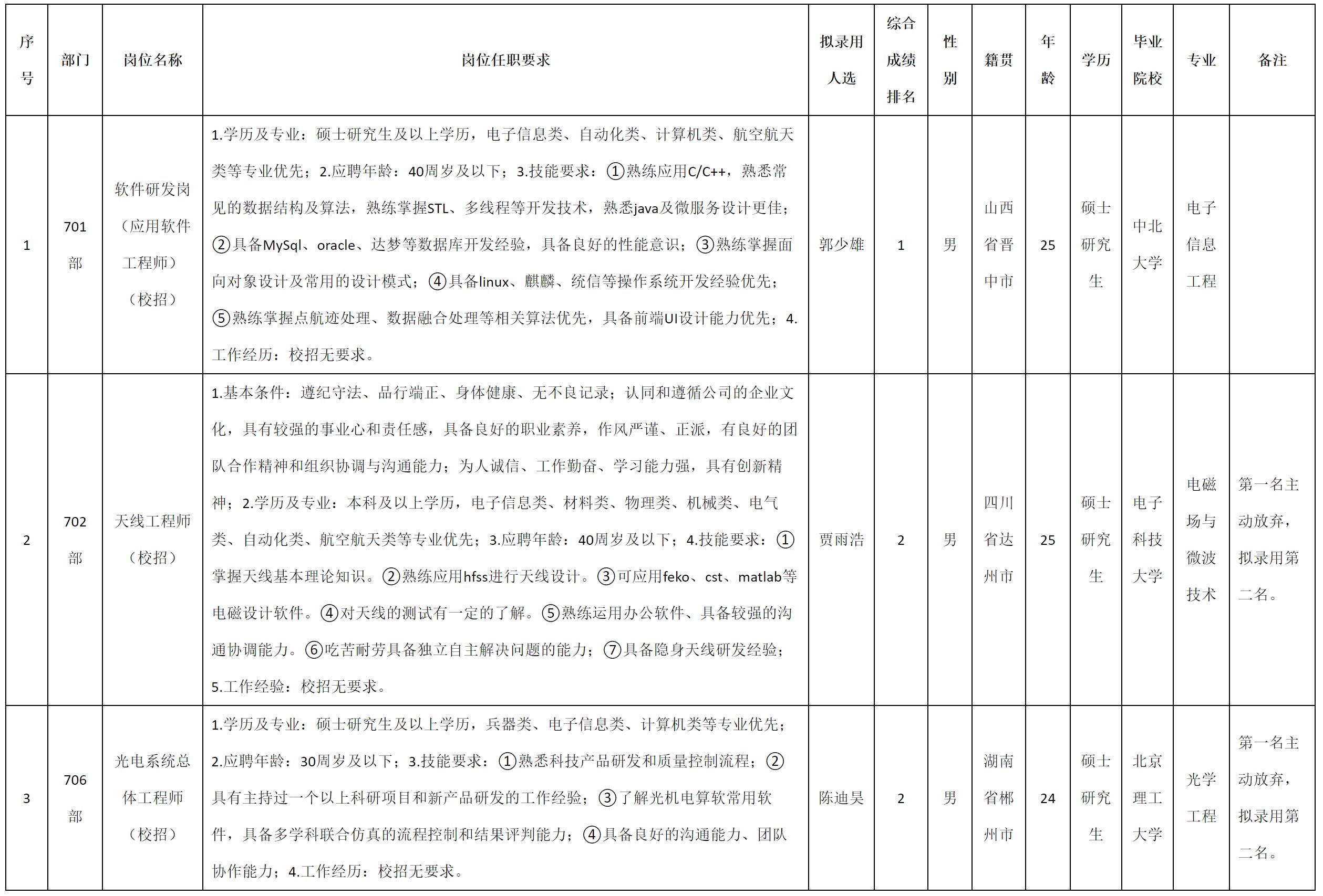 根據(jù)四川九洲電器集團(tuán)有限責(zé)任公司發(fā)布的招聘公告及招聘相關(guān)規(guī)定,經(jīng)測(cè)試、考察、體檢等程序,擬錄用郭少雄等3名同志到四川九洲電器集團(tuán)有限責(zé)任公司工作,現(xiàn)予以公示,具體情況如下: