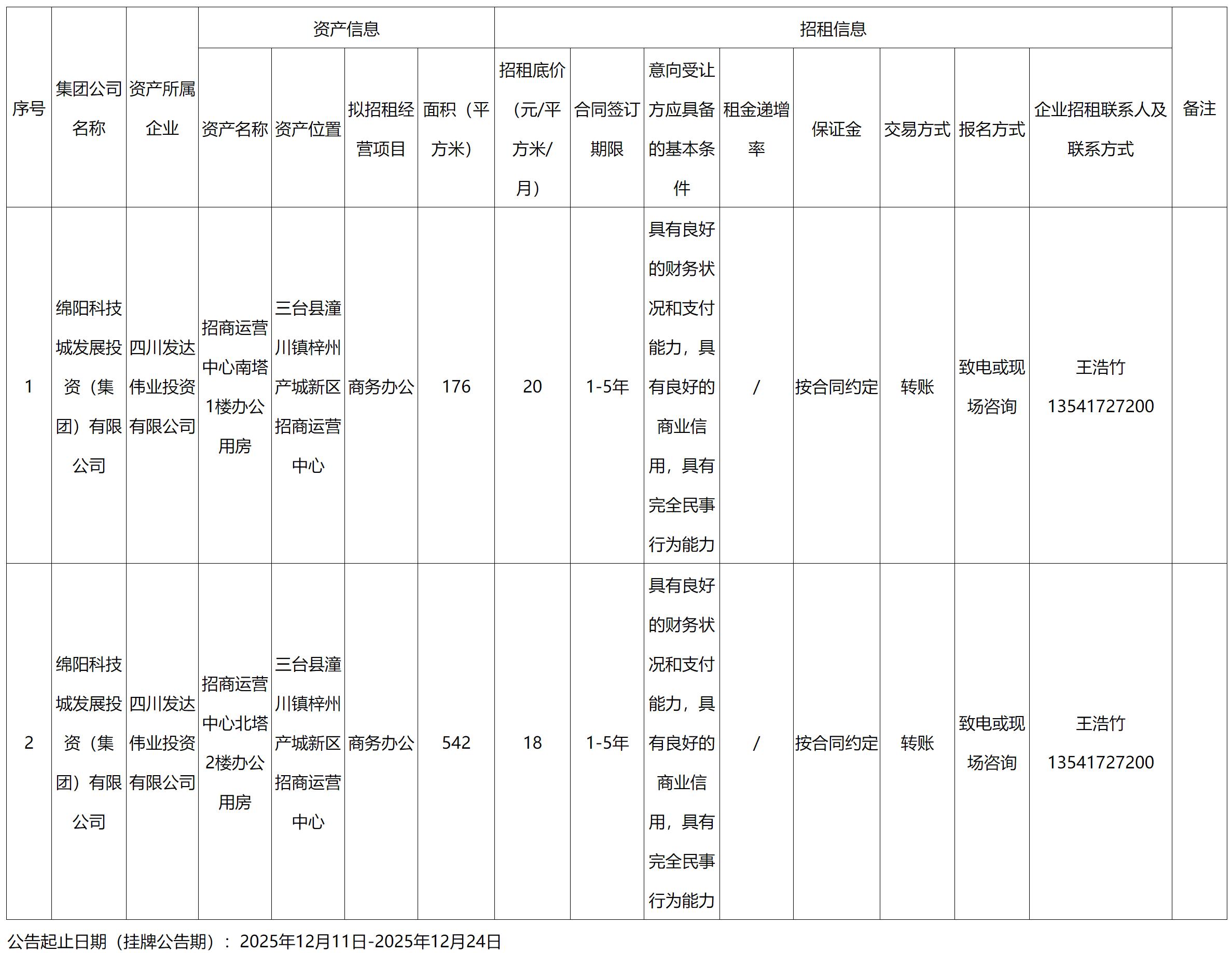 發(fā)達(dá)偉業(yè)公司資產(chǎn)招租公開信息表