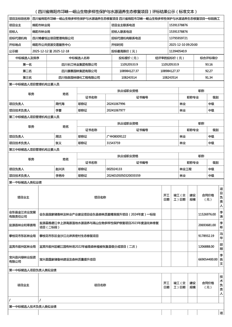 四川省綿陽市邛崍一岷山生物多樣性保護(hù)與水源涵養(yǎng)生態(tài)修復(fù)項目評標(biāo)結(jié)果公示(一標(biāo)段)