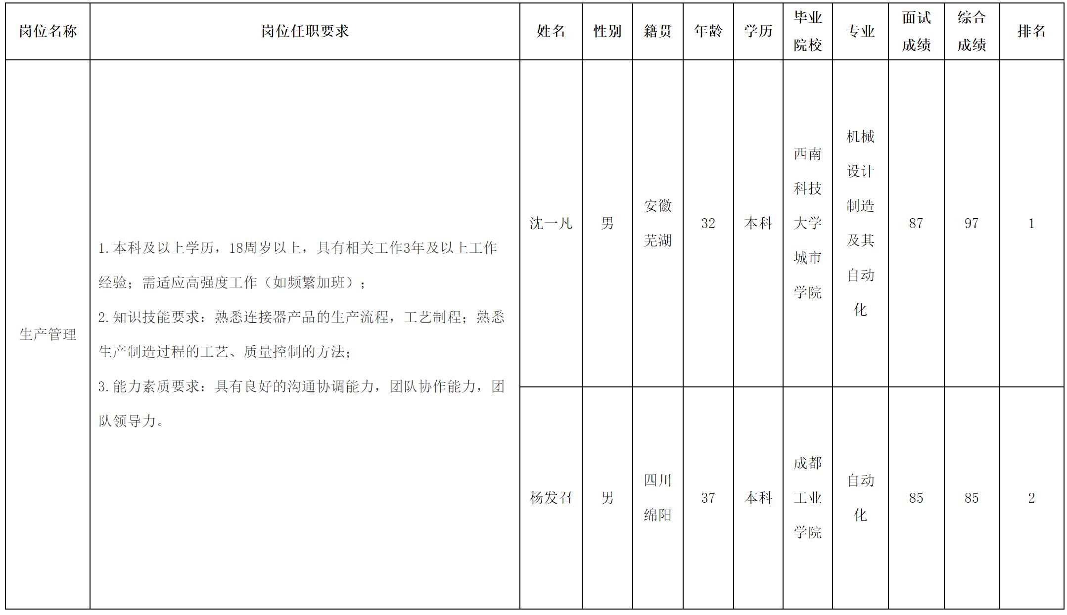 根據(jù)四川華豐科技股份有限公司發(fā)布的招聘公告及招聘相關(guān)規(guī)定,現(xiàn)將測(cè)試成績(jī)予以公示。