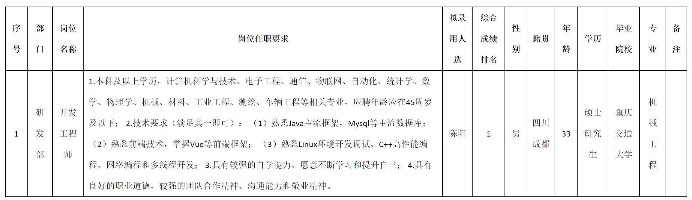 根據四川九洲投資控股集團有限公司軟件與數據智能軍團發(fā)布的招聘公告及招聘相關規(guī)定,經測試、考察、體檢等程序,擬錄用陳陽同志到四川九洲投資控股集團有限公司軟件與數據智能軍團工作,現予以公示,具體情況如下:
