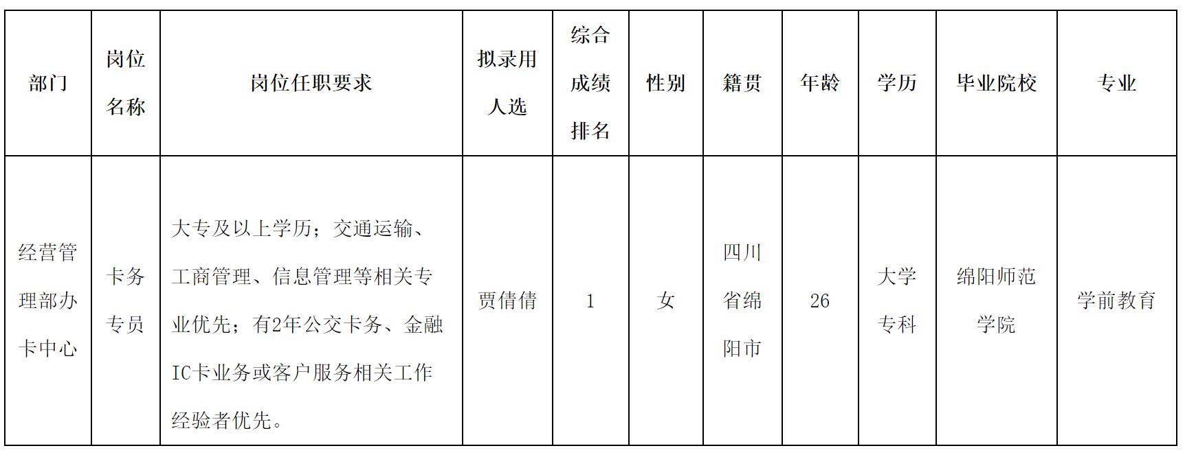 根據(jù)綿陽市綿州通科技有限責任公司發(fā)布的招聘公告及招聘相關(guān)規(guī)定,經(jīng)筆試、面試、體檢等程序,擬錄用賈倩倩到綿陽市綿州通科技有限責任公司工作,現(xiàn)予以公示,具體情況如下: