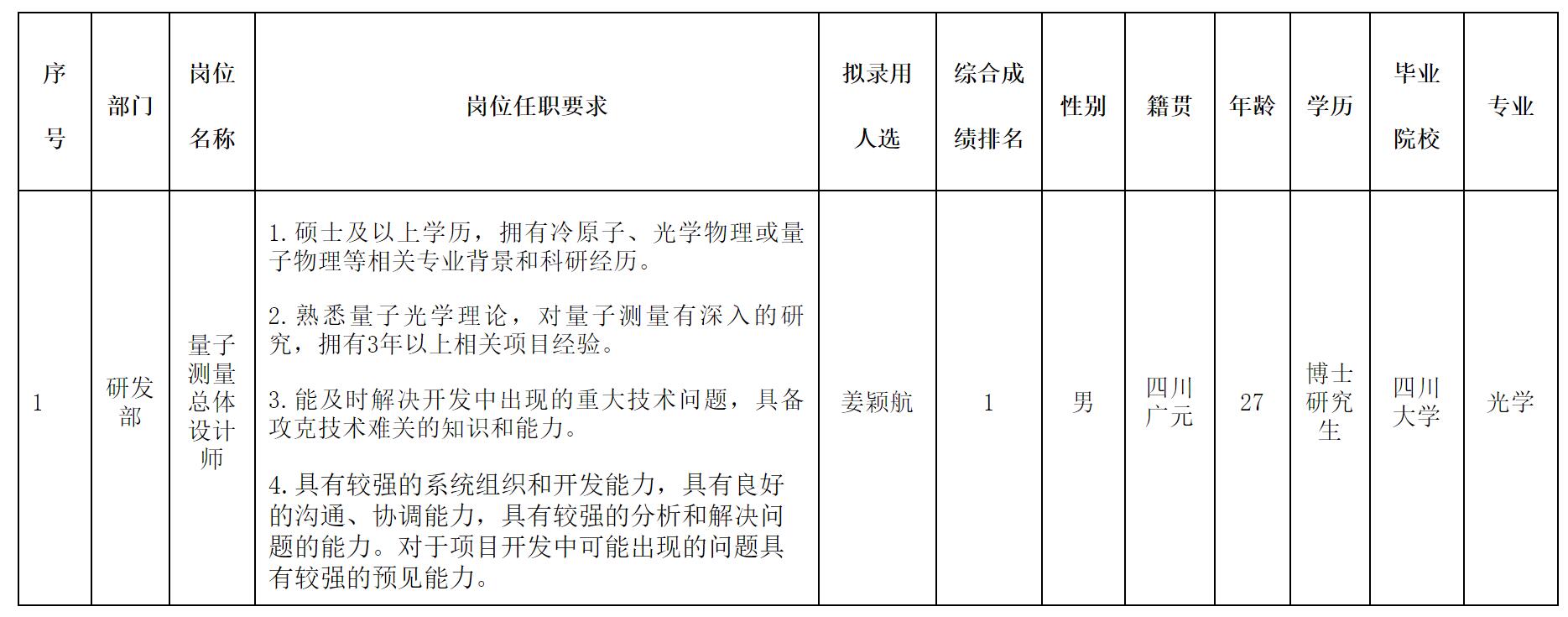 根據(jù)四川長虹電子科技有限公司發(fā)布的招聘公告及招聘相關規(guī)定,經(jīng)筆試、面試、考察、體檢等程序,擬錄用姜穎航同志到公司研發(fā)部工作,現(xiàn)予以公示,具體情況如下: