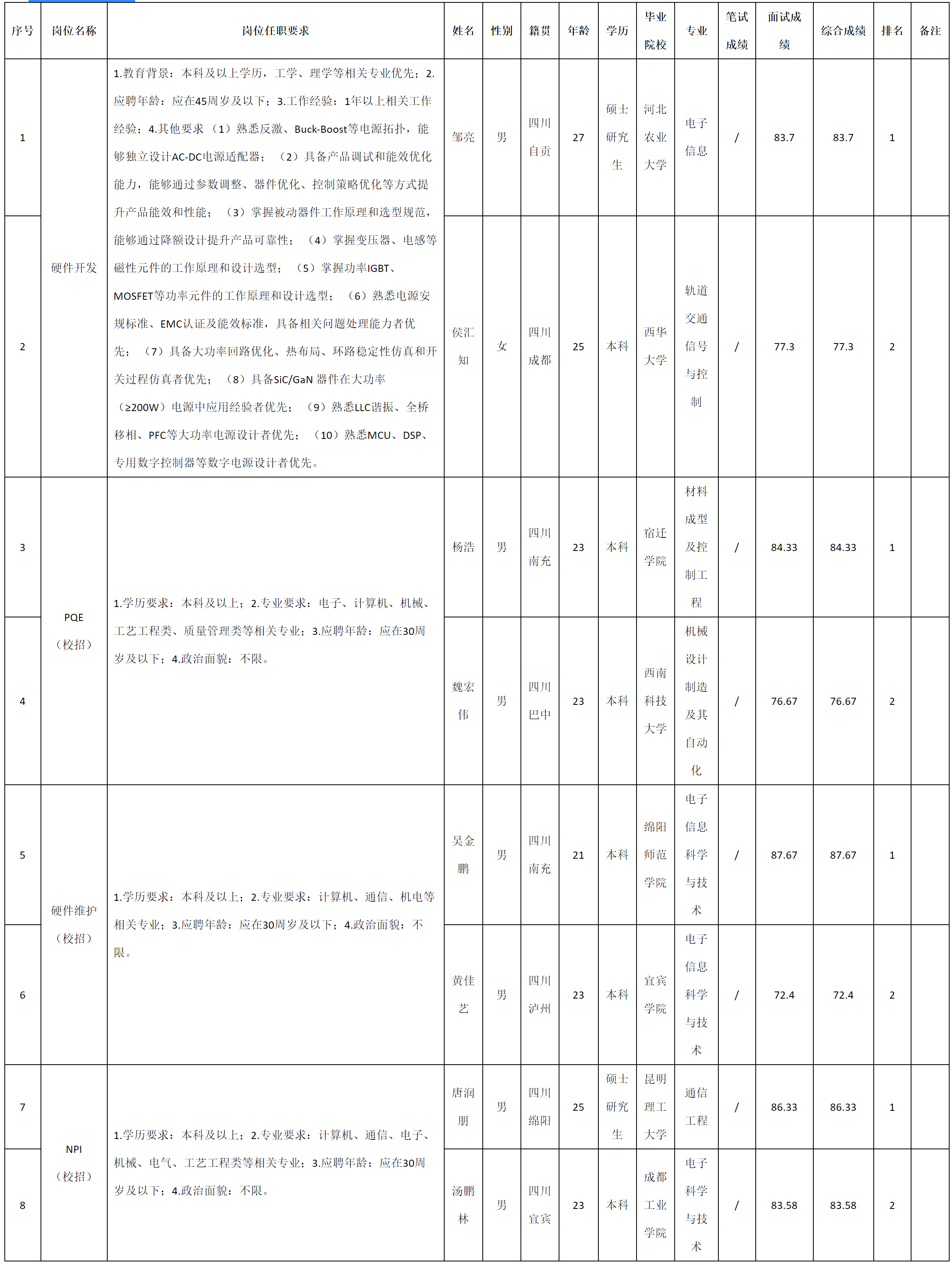 根據(jù)四川九州電子科技股份有限公司發(fā)布的招聘公告及招聘相關(guān)規(guī)定,現(xiàn)將測試成績予以公示。