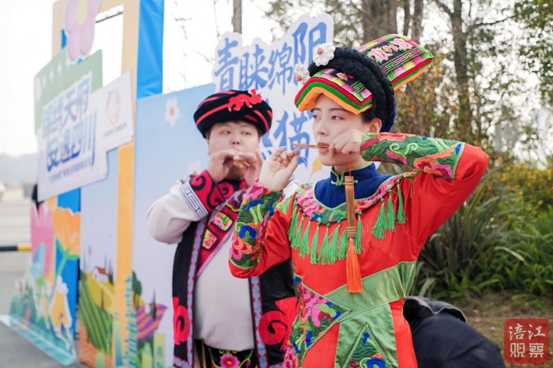 在民族風(fēng)情區(qū),身穿民族服裝的漢子吹羌笛、花帽姑娘轉(zhuǎn)繡球,背景“青睞綿陽(yáng) 熊貓家園”立牌與服飾相映成趣。“沒想到鄉(xiāng)村不僅有景,還有這么濃的文化味兒!”一位游客邊拍視頻邊感嘆。