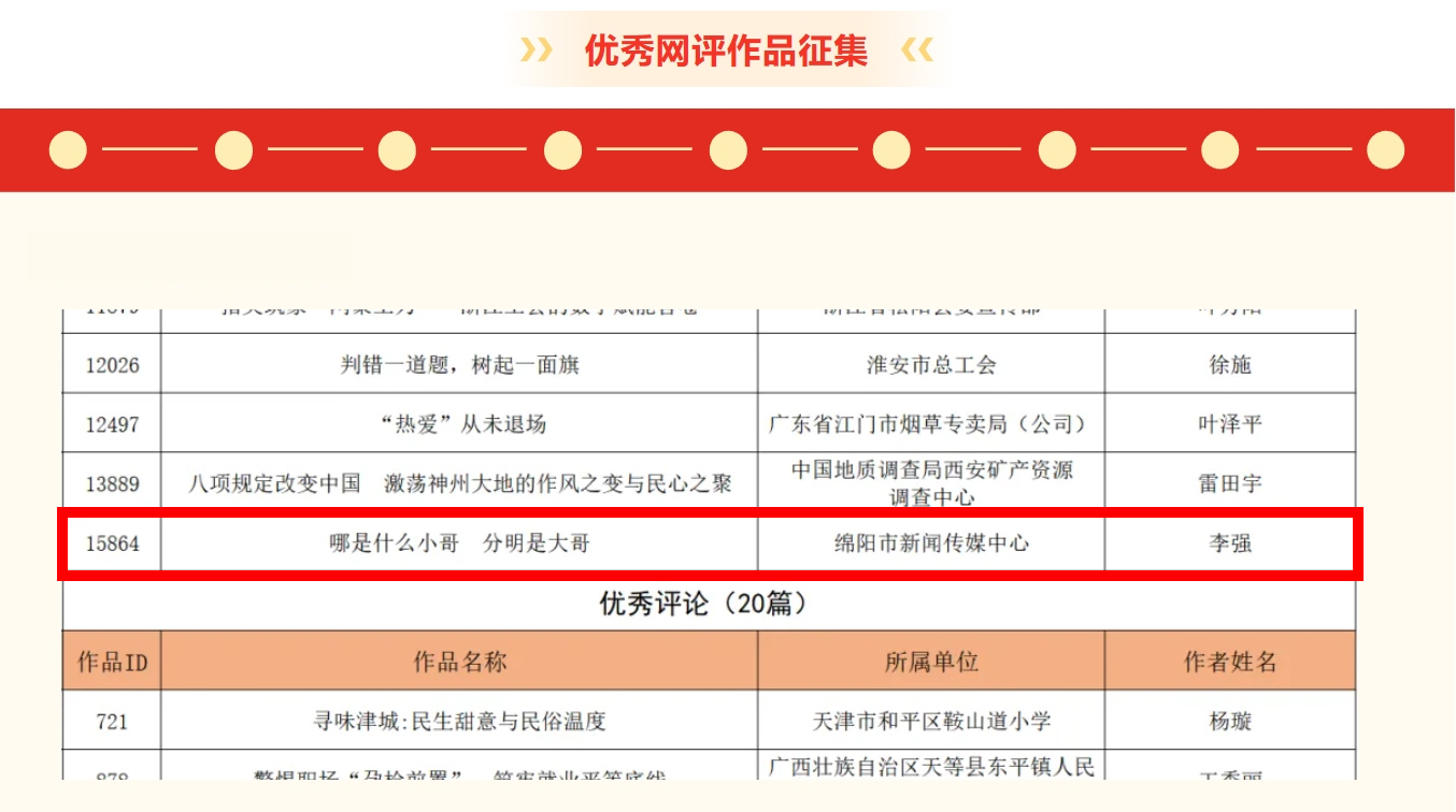 近日,由中華全國(guó)總工會(huì)、中央網(wǎng)信辦主辦的2025年“網(wǎng)聚職工正能量 爭(zhēng)做中國(guó)好網(wǎng)民”主題活動(dòng)各子項(xiàng)目已完成網(wǎng)絡(luò)投票和專家評(píng)審,正在對(duì)結(jié)果進(jìn)行公示。其中,綿陽(yáng)市新聞傳媒中心李強(qiáng)的作品《哪是什么“小哥”,分明是“大哥”》入選“優(yōu)秀網(wǎng)評(píng)作品”最佳文字評(píng)論。