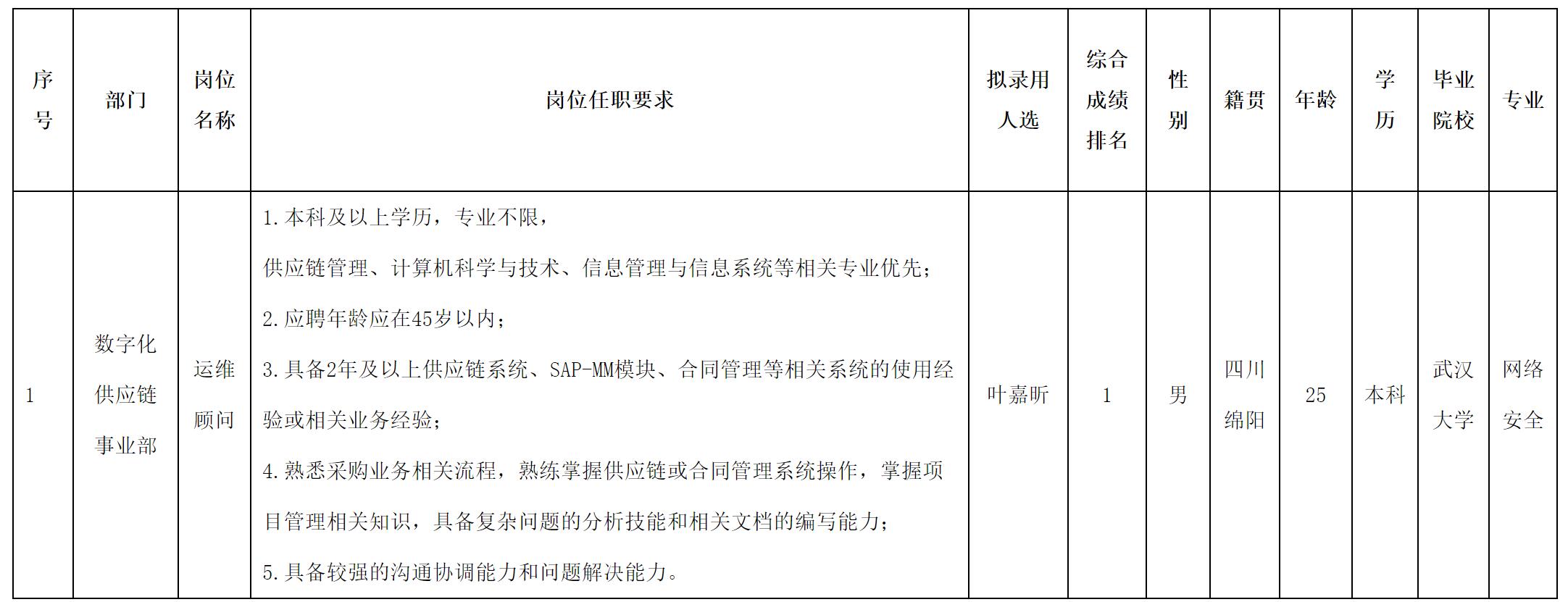 根據四川虹信軟件股份有限公司發(fā)布的招聘公告及招聘相關規(guī)定,經測試、考察、體檢等程序,擬錄用葉嘉昕同志到四川虹信軟件股份有限公司工作,現(xiàn)予以公示,具體情況如下: