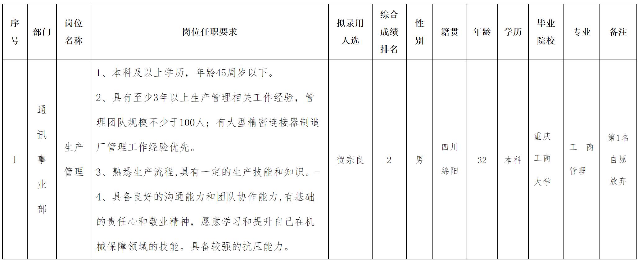 根據(jù)四川華豐科技股份有限公司發(fā)布的招聘公告及招聘相關(guān)規(guī)定,經(jīng)測(cè)試等程序,擬錄用賀宗良同志到四川華豐科技股份有限公司工作,現(xiàn)予以公示,具體情況如下:
