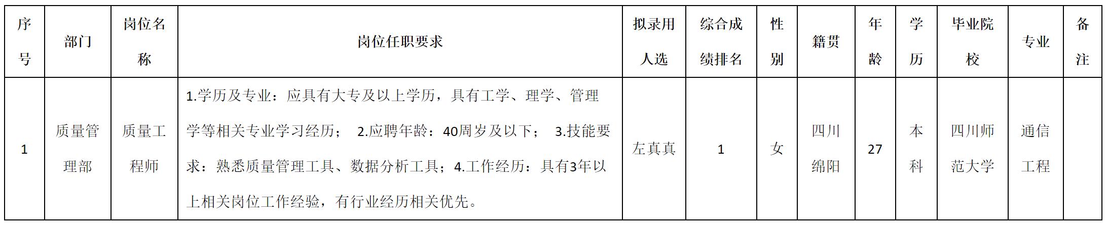 根據(jù)四川九華光子通信技術(shù)有限公司發(fā)布的招聘公告及招聘相關(guān)規(guī)定,經(jīng)測試、考察、體檢等程序,擬錄用左真真同志到四川九華光子通信技術(shù)有限公司工作,現(xiàn)予以公示,具體情況如下: