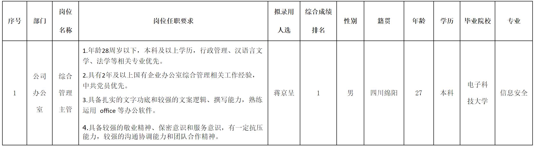 根據(jù)四川長虹電子控股集團有限公司發(fā)布的招聘公告及招聘相關(guān)規(guī)定,經(jīng)測試、考察、體檢等程序,擬錄用蔣京呈同志到公司工作,現(xiàn)予以公示,具體情況如下: