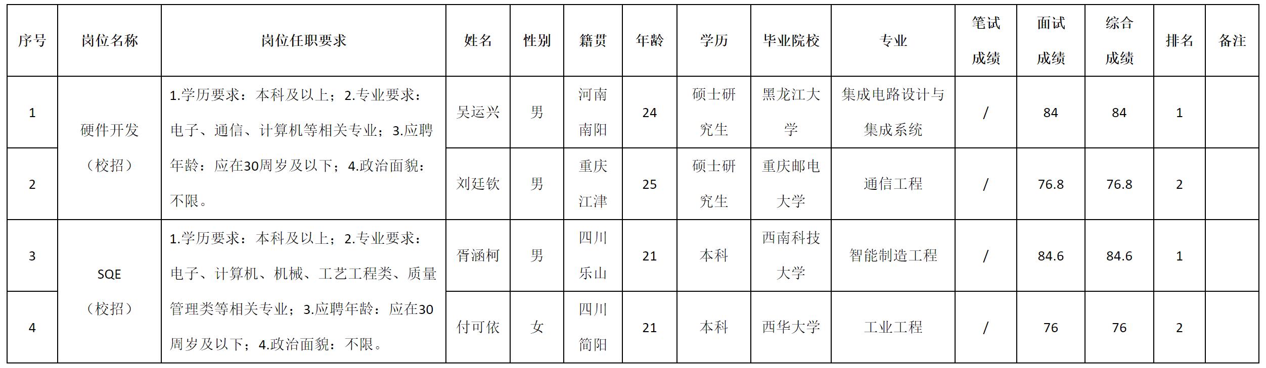 根據(jù)四川九州電子科技股份有限公司發(fā)布的招聘公告及招聘相關(guān)規(guī)定,現(xiàn)將測(cè)試成績(jī)予以公示。