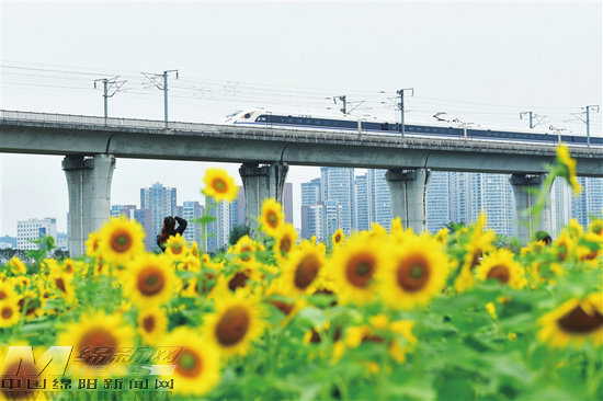 游仙區(qū)石馬鎮(zhèn)紅巖水電站附近,高速動(dòng)車穿越向日葵花海。 記者 王勇 攝