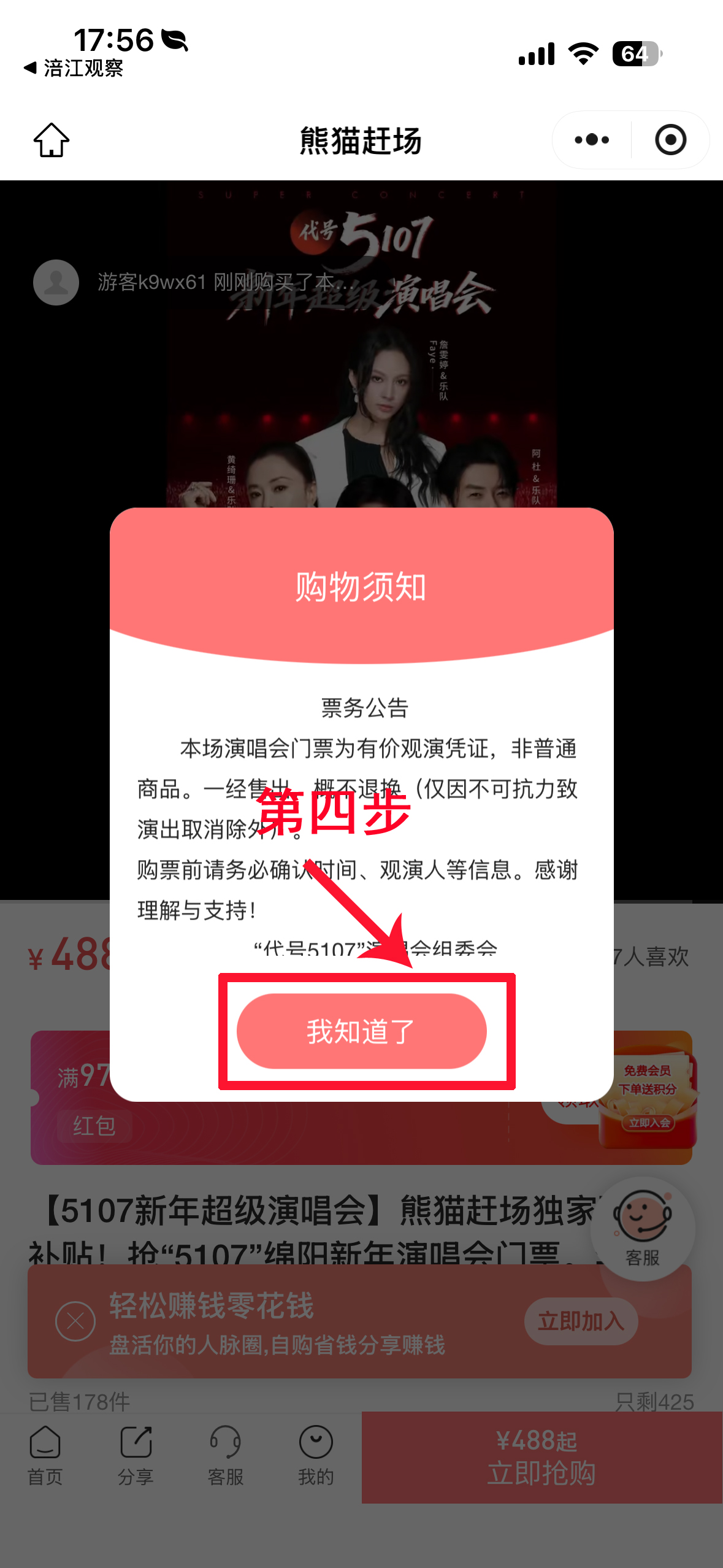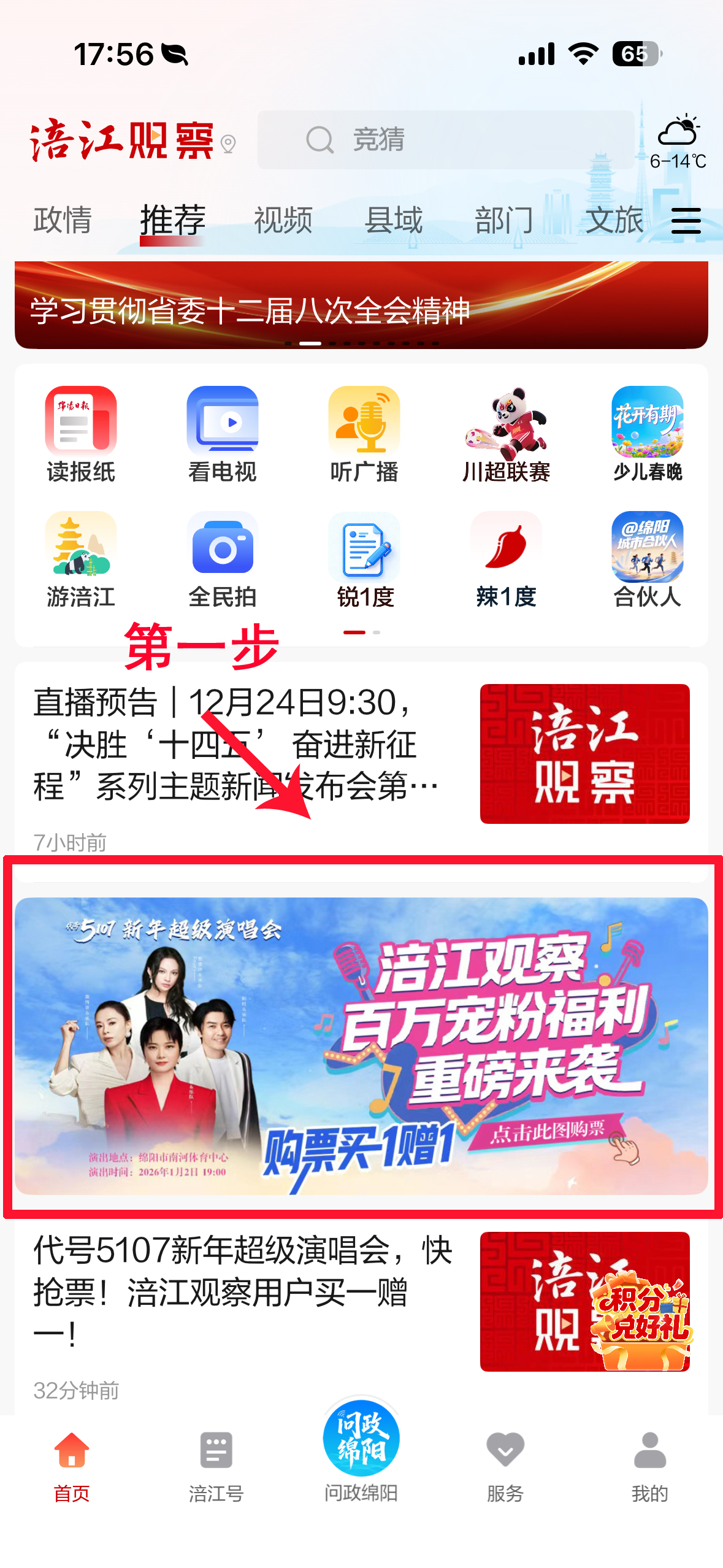 第一步:下載安裝綿陽官方新聞客戶端涪江觀察,在首頁點擊【涪江觀察百萬寵粉福利】購票入口,即可進入“熊貓趕場”小程序購票頁面;