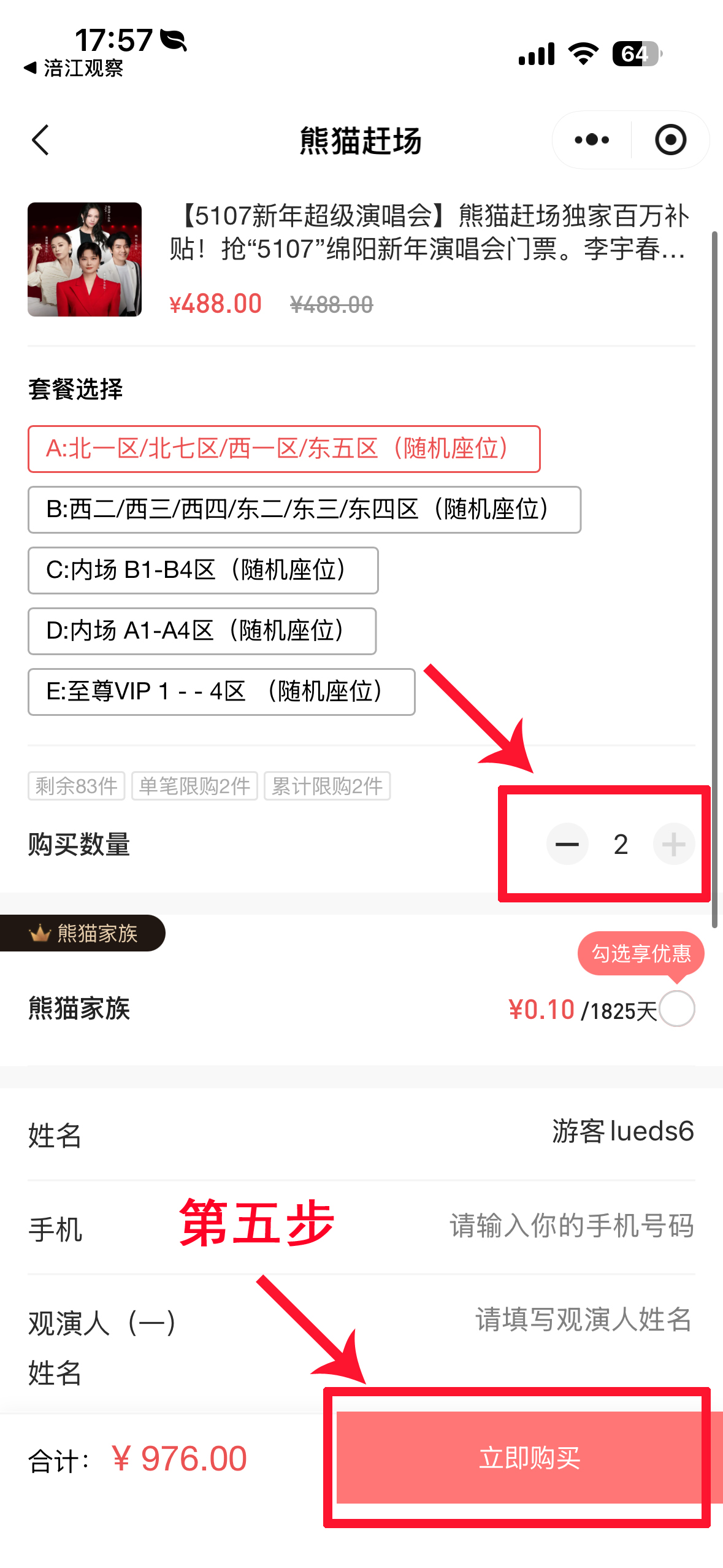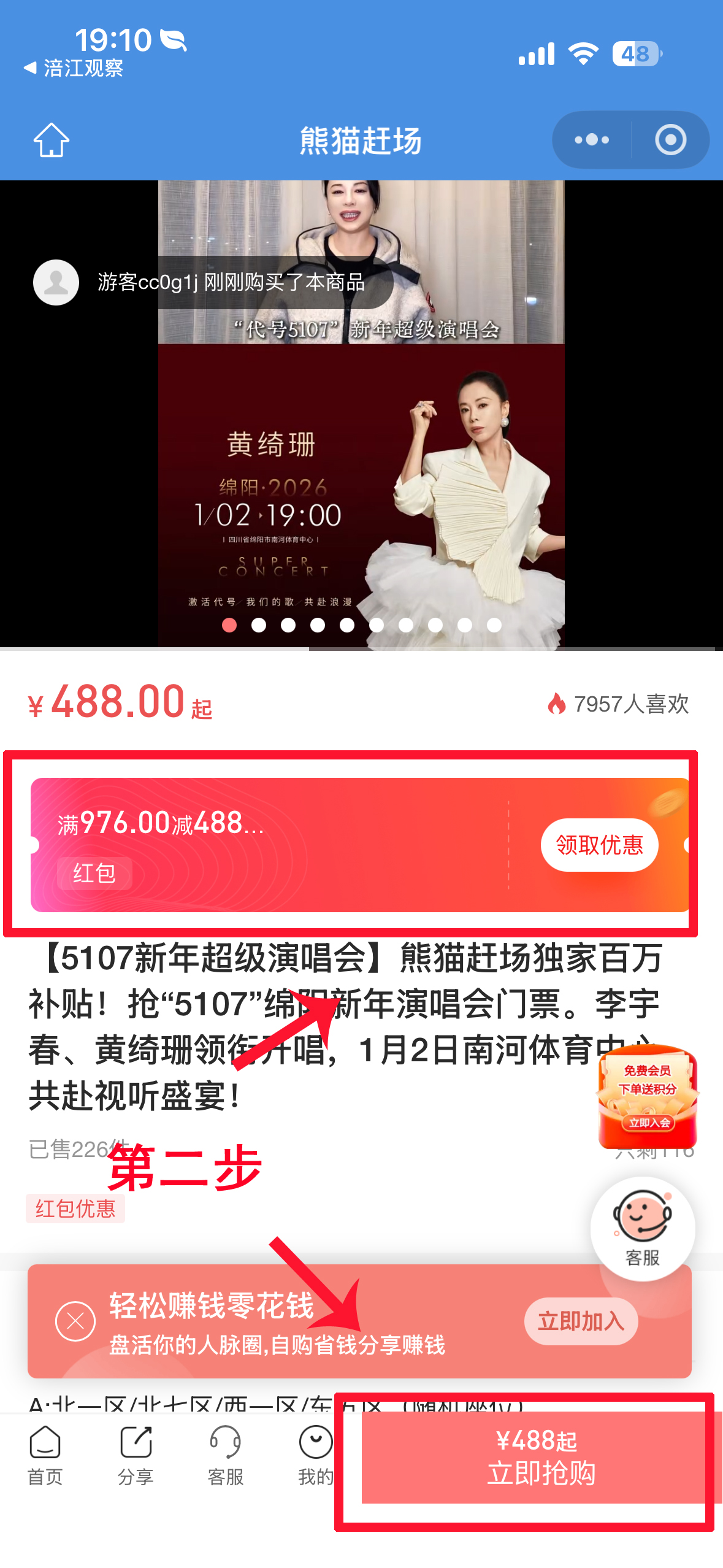 第二步:在“熊貓趕場”平臺先領(lǐng)取對應(yīng)價位的優(yōu)惠券,再點擊“立即搶購”,購買數(shù)量選擇“2”,即可享受買一贈一。