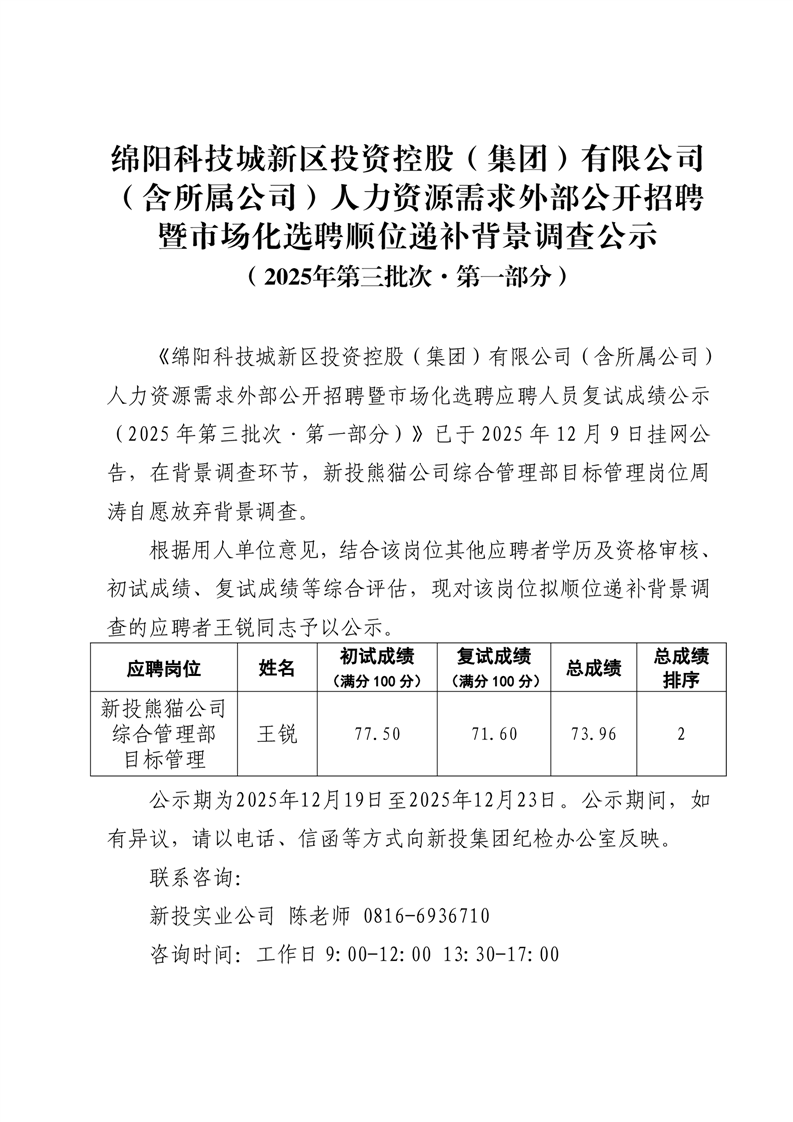 綿陽科技城新區(qū)投資控股(集團(tuán))有限公司(含所屬公司)人力資源需求外部公開招聘暨市場化選聘順位遞補(bǔ)背景調(diào)查公示(2025年第三批次·第一部分)