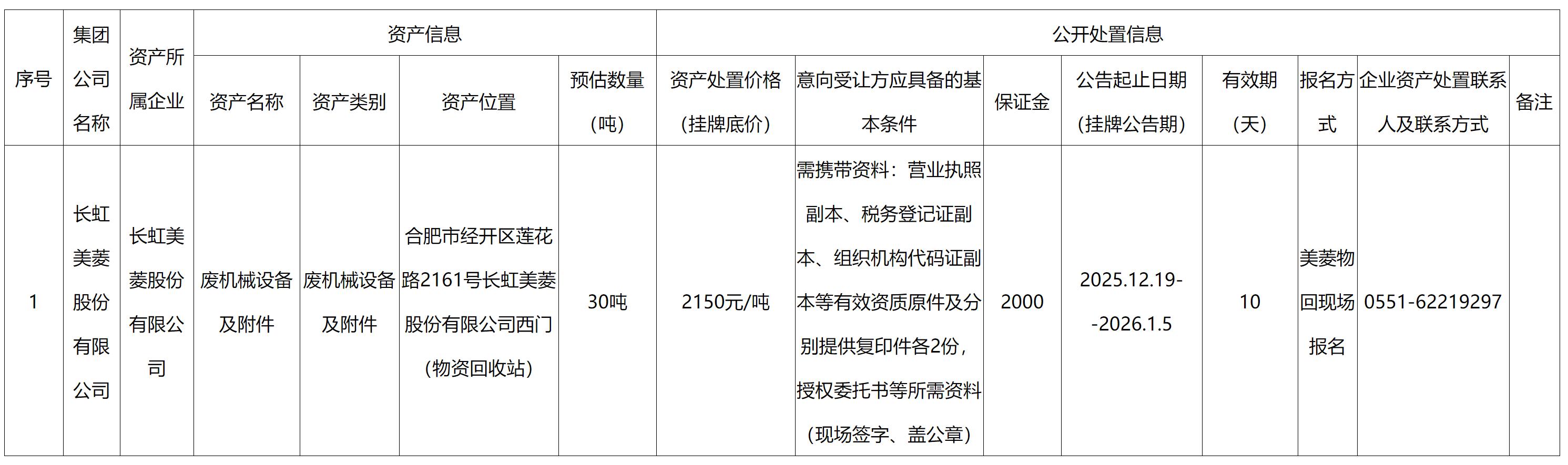 長(zhǎng)虹美菱股份有限公司資產(chǎn)處置公告