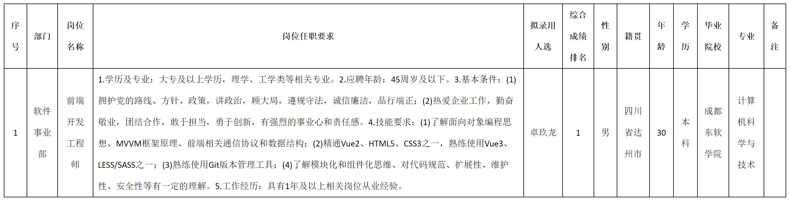 根據(jù)四川九強(qiáng)通信科技有限公司發(fā)布的招聘公告及招聘相關(guān)規(guī)定,經(jīng)測(cè)試、考察、體檢等程序,擬錄用卓玖龍同志到四川九強(qiáng)通信科技有限公司工作,現(xiàn)予以公示,具體情況如下: