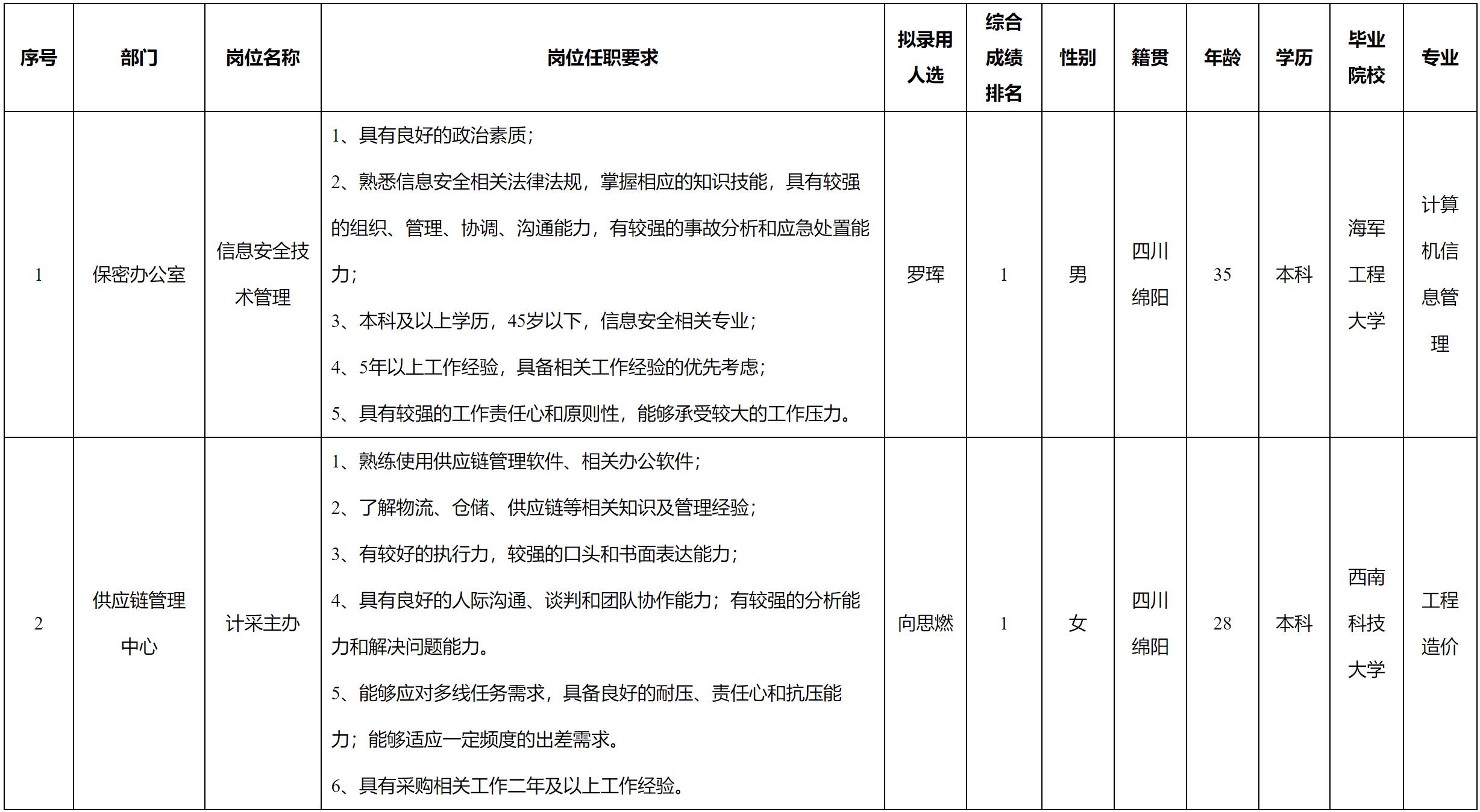 根據(jù)四川長(zhǎng)虹電源股份有限公司發(fā)布的招聘公告及招聘相關(guān)規(guī)定,經(jīng)測(cè)試、考察、體檢等程序,擬錄用羅琿、向思燃同志到我司工作,現(xiàn)予以公示,具體情況如下: