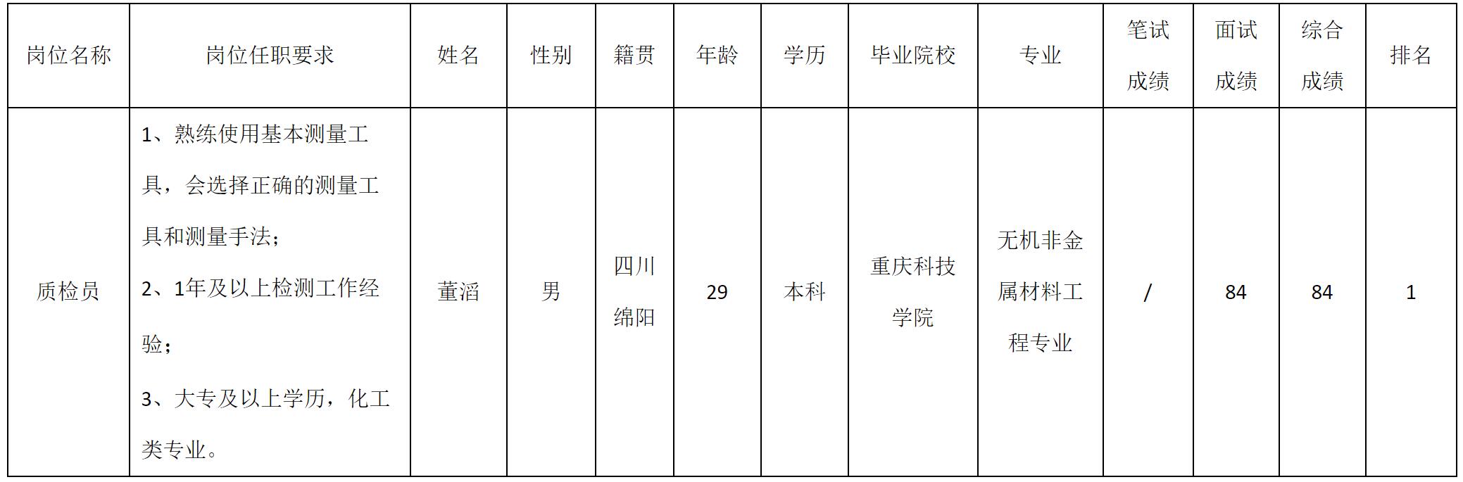 根據(jù)四川長(zhǎng)虹新材料科技有限公司發(fā)布的招聘公告及招聘相關(guān)規(guī)定,經(jīng)面試等程序,現(xiàn)將面試成績(jī)予以公示。