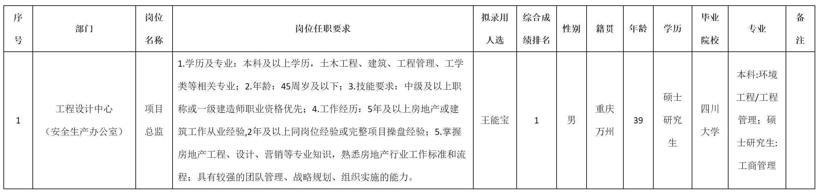 根據(jù)九洲千城置業(yè)有限責(zé)任公司發(fā)布的招聘公告及招聘相關(guān)規(guī)定,經(jīng)測試、考察、體檢等程序,擬錄用王能寶同志到九洲千城置業(yè)有限責(zé)任公司工作,現(xiàn)予以公示,具體情況如下: