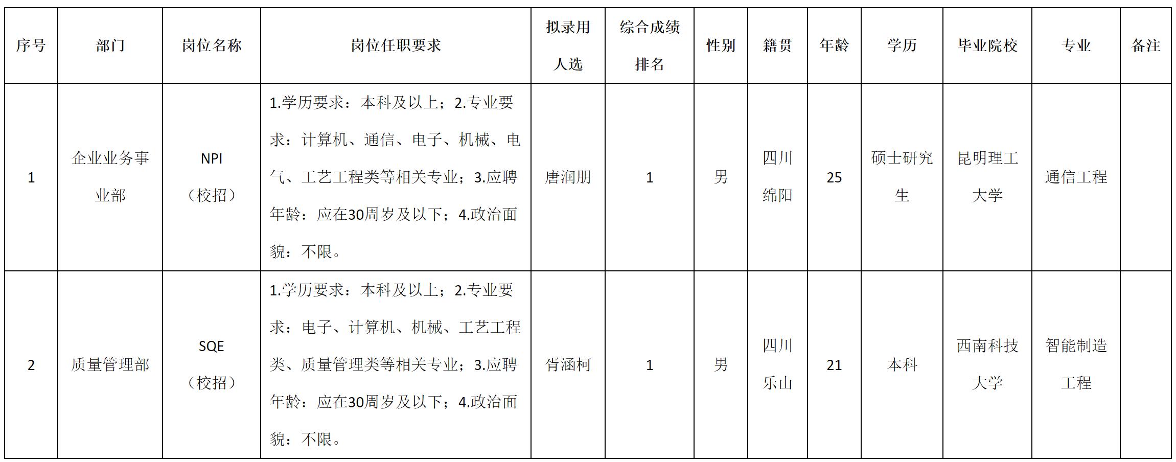 根據(jù)四川九州電子科技股份有限公司發(fā)布的招聘公告及招聘相關(guān)規(guī)定,經(jīng)測試、考察、體檢等程序,擬錄用唐潤朋等2名同志到四川九州電子科技股份有限公司工作,現(xiàn)予以公示,具體情況如下: