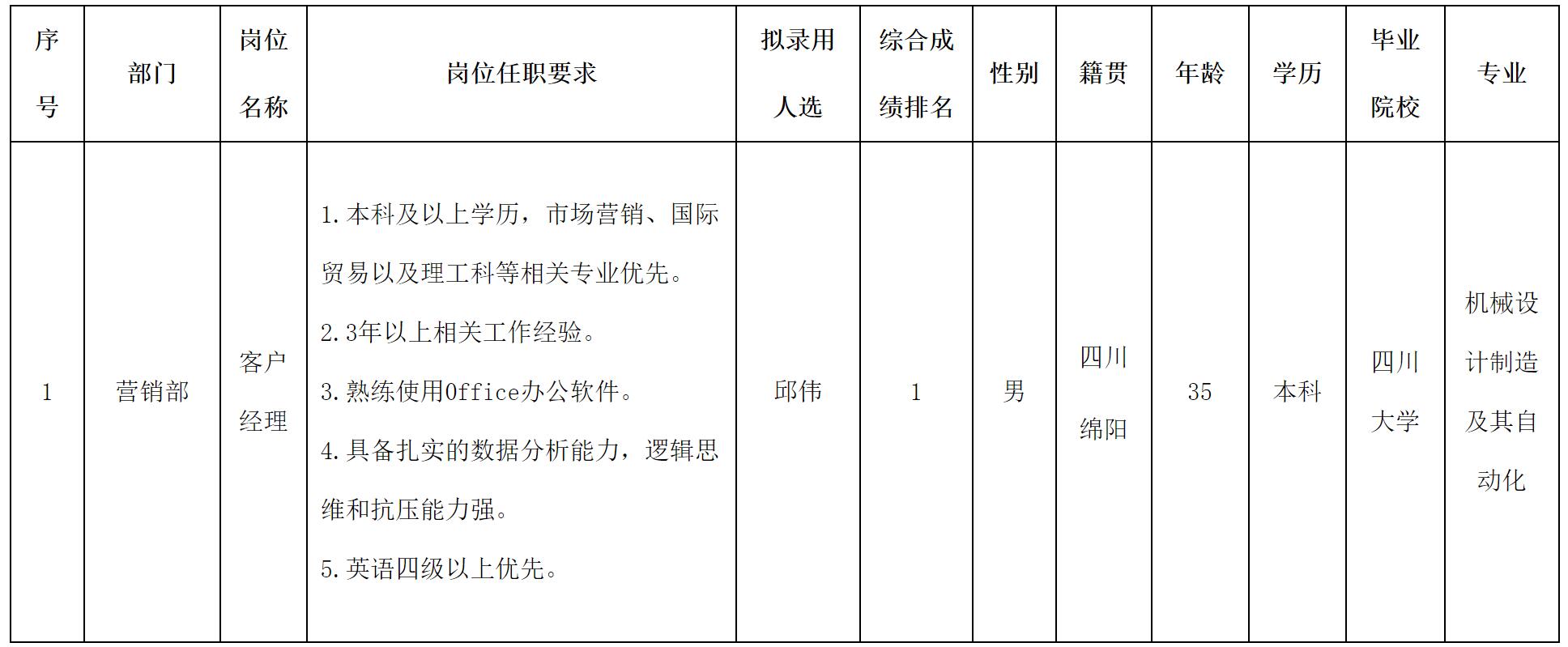 根據(jù)四川能創(chuàng)智電科技有限責(zé)任公司發(fā)布的招聘公告及招聘相關(guān)規(guī)定,經(jīng)面試、考察、體檢等程序,擬錄用邱偉同志到公司工作,現(xiàn)予以公示,具體情況如下: