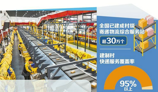 越來越多的農(nóng)特產(chǎn)品搭上快遞“快車”,從大山深處走向全國市場。國家郵政局?jǐn)?shù)據(jù)顯示,目前,全國已建成村級寄遞物流綜合服務(wù)站超30萬個,建制村快遞服務(wù)覆蓋率達(dá)95%以上。