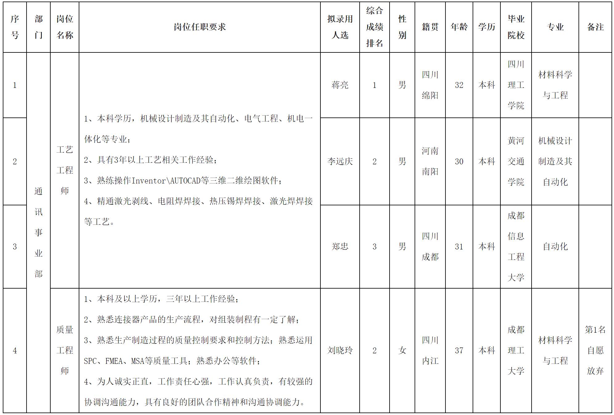 根據(jù)四川華豐科技股份有限公司發(fā)布的招聘公告及招聘相關(guān)規(guī)定,經(jīng)測試等程序,擬錄用蔣亮等同志到四川華豐科技股份有限公司工作,現(xiàn)予以公示,具體情況如下: