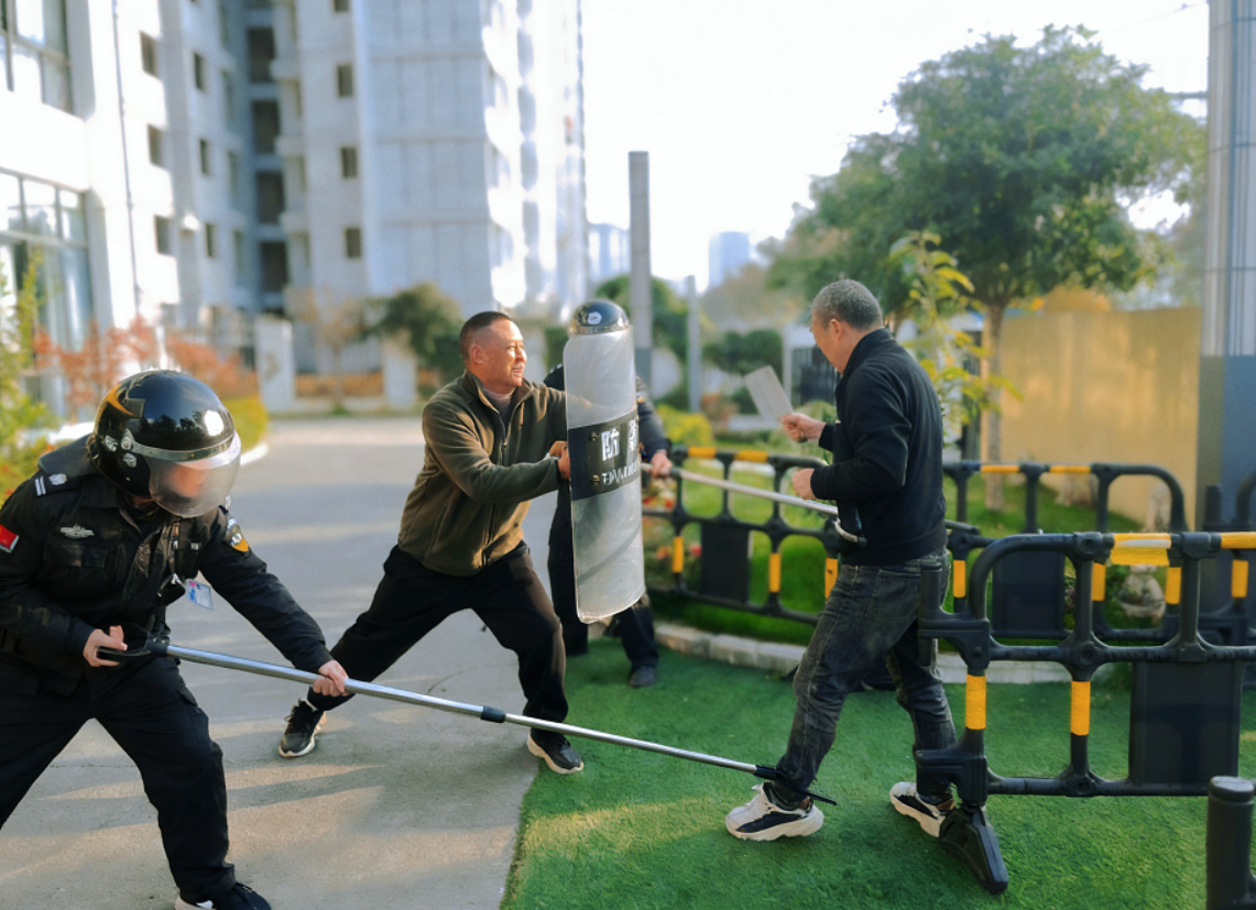 警報(bào)響起,各班教師聞聲而動(dòng),迅速帶領(lǐng)幼兒執(zhí)行“關(guān)窗鎖門、隱蔽躲藏、安靜避險(xiǎn)”三步法,隨后第一時(shí)間向指揮組上報(bào)班級(jí)安全情況。與此同時(shí),保安人員和安全應(yīng)急小組成員攜帶防暴盾、鋼叉火速集結(jié),采用“盾在前、叉在后”的協(xié)同戰(zhàn)術(shù),與“暴徒”周旋對(duì)峙,精準(zhǔn)卡位阻攔其靠近幼兒活動(dòng)區(qū)域,最終合力將“暴徒”成功制服。