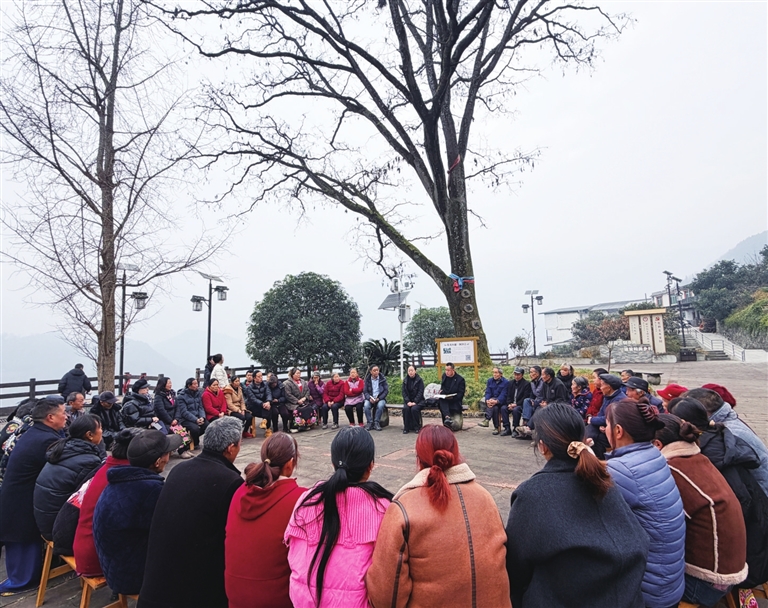 分紅結(jié)束后,村民們并沒有離開,而是從村委會(huì)搬出幾張木凳子,在門前的皂角樹下圍成一圈,一場(chǎng)壩壩會(huì)談起了“石椅村明年該咋個(gè)干”。