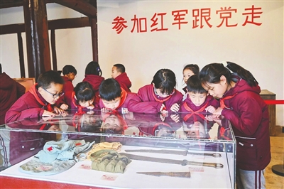 學生瞻仰梓潼縣許州紅軍革命歷史紀念館烈士遺物。