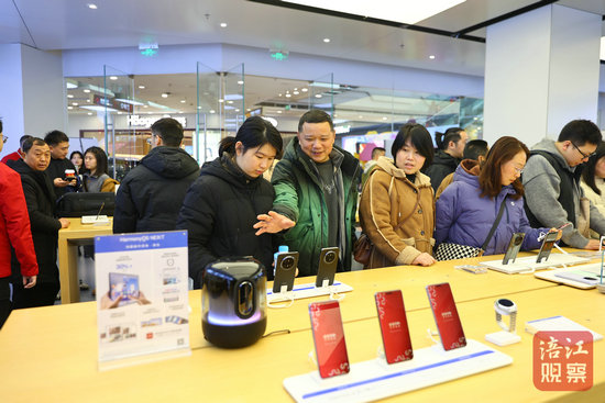 市民趙紫維帶著媽媽逛了幾家手機(jī)店后,最后決定入手國(guó)產(chǎn)手機(jī)華為。“我媽媽手機(jī)用的年限比較久了,就想換一個(gè)新的,趁著過(guò)年,我們一起來(lái)選購(gòu)一下。剛好又知道有這個(gè)國(guó)補(bǔ)政策,就想趁機(jī)會(huì)買了。”趙紫維說(shuō),剛下單的手機(jī)原本售價(jià)5499元,補(bǔ)貼之后需付4999元,省了500元,很開(kāi)心。