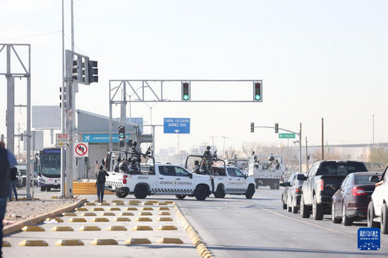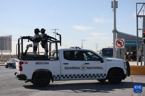 2月4日,墨西哥國(guó)民警衛(wèi)隊(duì)員抵達(dá)墨西哥北部奇瓦瓦州華雷斯市。新華社記者 李夢(mèng)馨 攝