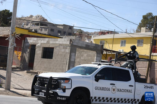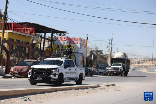 2月4日,墨西哥國(guó)民警衛(wèi)隊(duì)員在墨西哥北部奇瓦瓦州華雷斯市巡邏。新華社記者 李夢(mèng)馨 攝