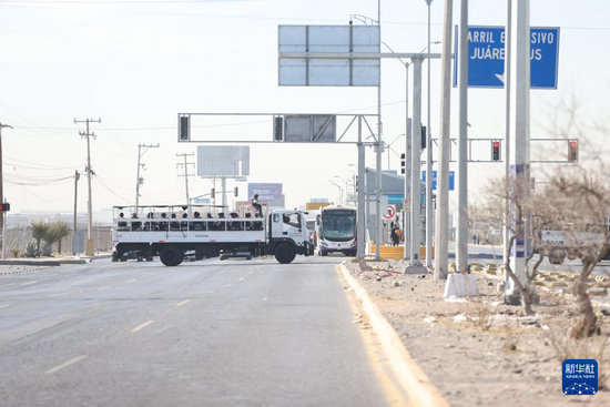 新華社記者當(dāng)天在華雷斯看到,約120名國(guó)民警衛(wèi)隊(duì)員搭乘軍機(jī)抵達(dá)該市機(jī)場(chǎng),隨即分乘多輛卡車(chē)前往邊境執(zhí)行任務(wù)。當(dāng)?shù)囟嗵幹饕缆吩O(shè)有安全檢查崗。