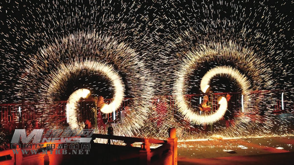在梓潼,表演者手持鐵水奮力擊打,鐵花絢爛飛濺,猶如滿天星辰點亮夜空,為現(xiàn)場觀眾帶來一場視覺盛宴。