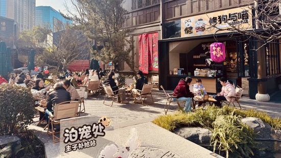 正月初三上午,在成都鐵像寺水街快閃店內(nèi),逼真的貓狗毛絨玩偶、印著熊貓圖案的蓋碗咖啡、以“修狗”為主題的文創(chuàng)周邊產(chǎn)品,讓年輕人直呼“萌化了”。點一杯“熊貓拿鐵”,捧著《云養(yǎng)一只修狗》的治愈繪本,拍照打卡的年輕人在這里找到一種“松弛感”的春節(jié)打開方式。