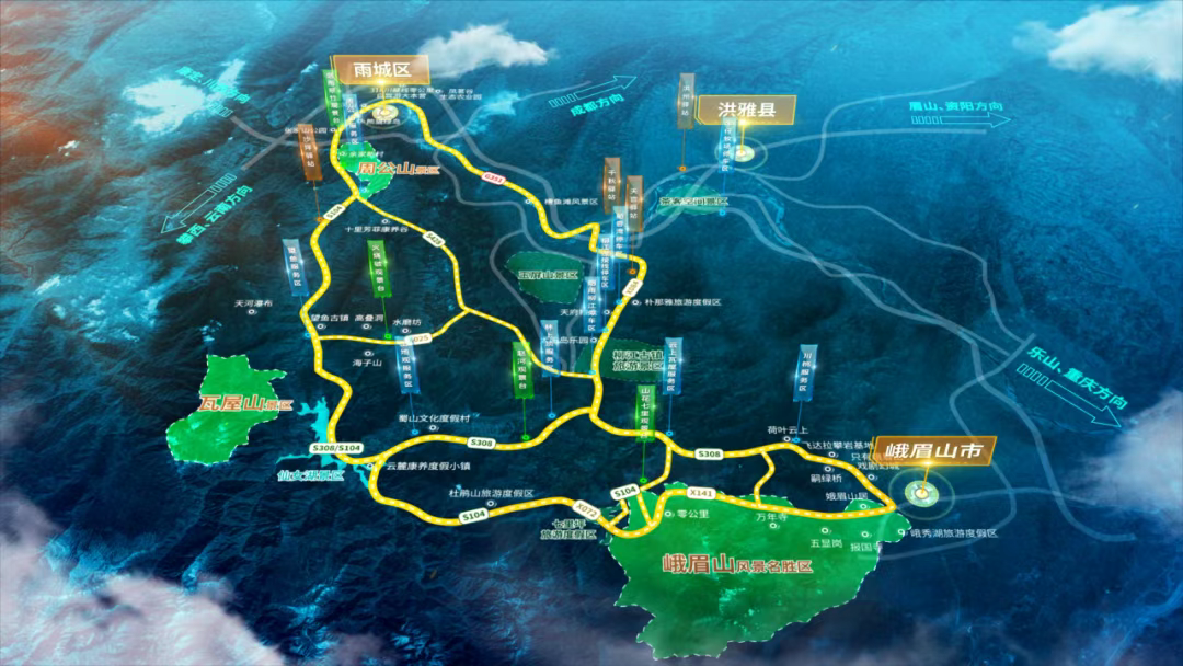 大峨眉“三山旅游環(huán)線”以串聯(lián)“佛國(guó)仙山”峨眉山、“最美桌山”瓦屋山、“文化名山”周公山三座名山而命名,地跨樂(lè)山、眉山、雅安三市,由G351、S104、X084等多條普通公路組成,總里程約333公里。沿線旅游資源優(yōu)質(zhì)豐富,不僅有世界級(jí)文旅資源“峨眉山—樂(lè)山大佛”、還有中國(guó)森林氧吧瓦屋山以及周公山、柳江古鎮(zhèn)、七里坪等旅游度假區(qū)。