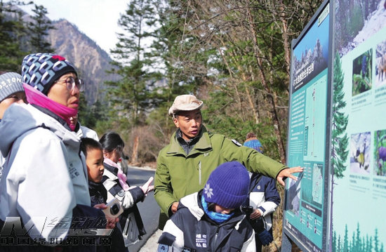 王朗片區(qū)還推出“給原始森林做體檢”主題線路,訪客們可通過這條線路進行研學(xué)探究。“聽解說加上學(xué)習(xí)標(biāo)識牌上的科普知識,即使是第一次來這里,也能很好地了解動植物知識。”第一次來到這里的成都游客林女士說,王朗既能玩雪,又能學(xué)習(xí)生態(tài)科普知識,孩子特別感興趣。