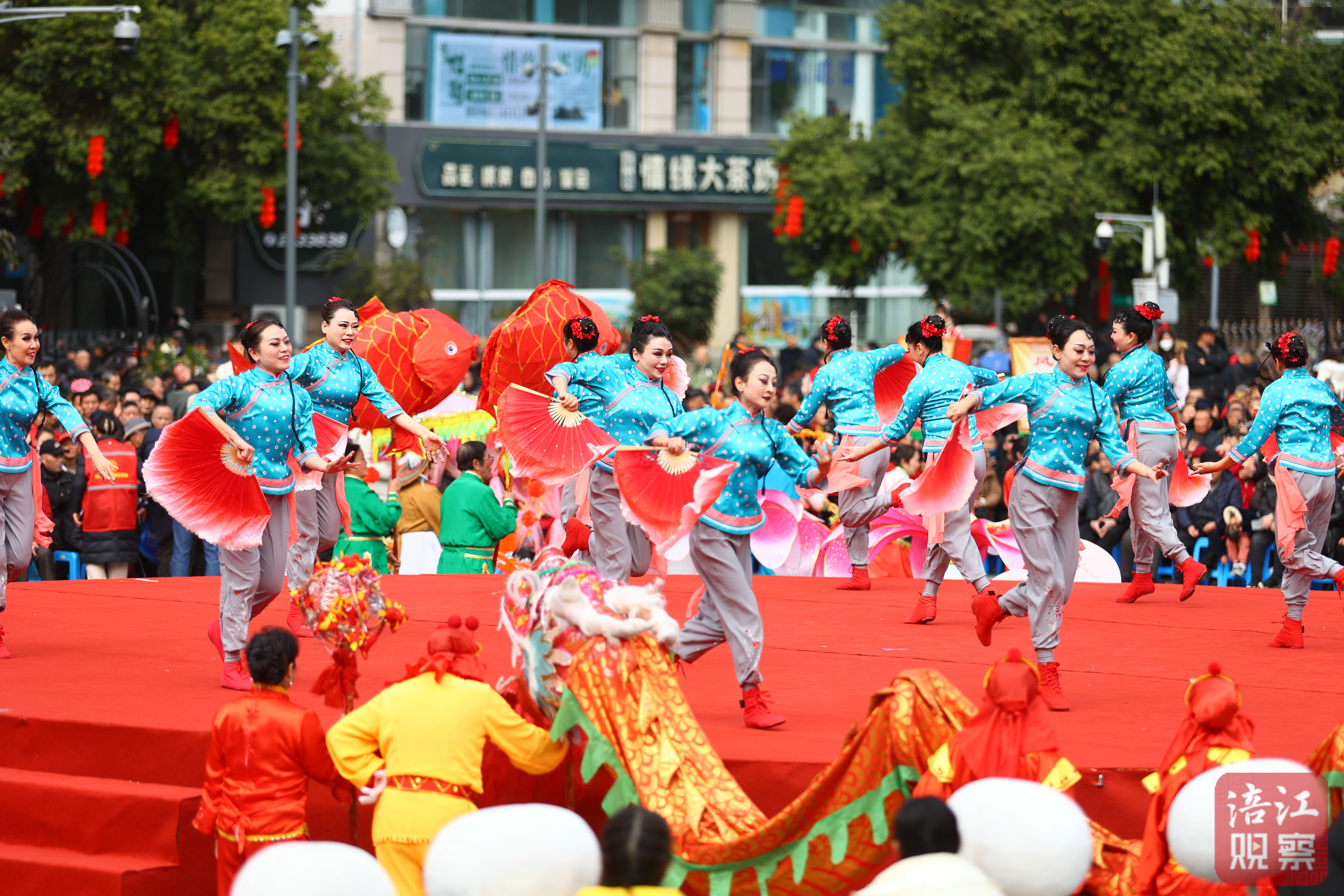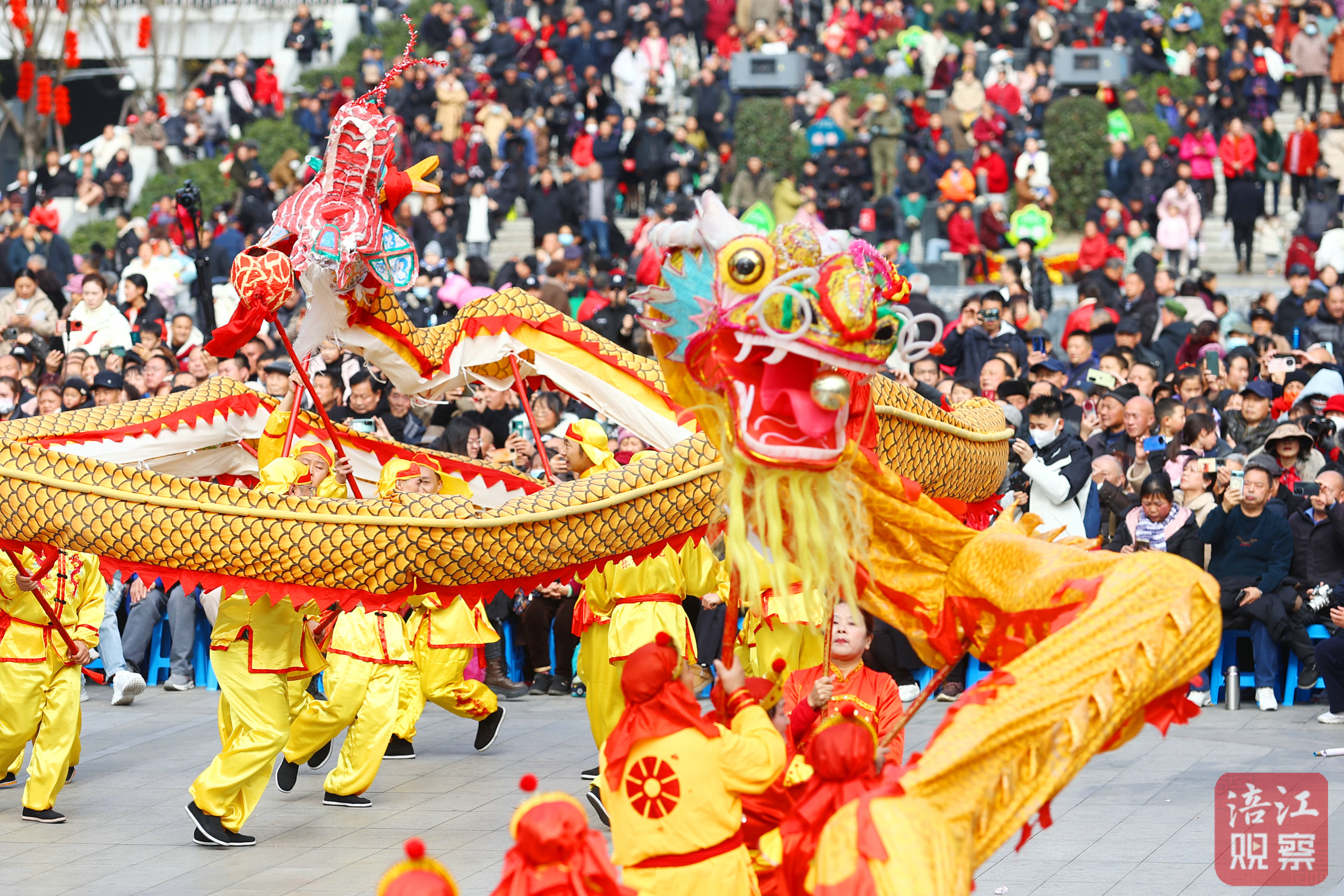 15:00,在鏗鏘的旋律中,歡騰的雄獅領著逶迤的祥龍翻騰而來,鹽亭蠶龍、樂加火龍隨后登場。舞臺上,舞蹈《出發(fā)吧春天》同步演出,臺上歡快的舞姿、臺下豪放灑脫的龍獅表演,讓新年的熱鬧與喜慶氛圍更加濃厚。