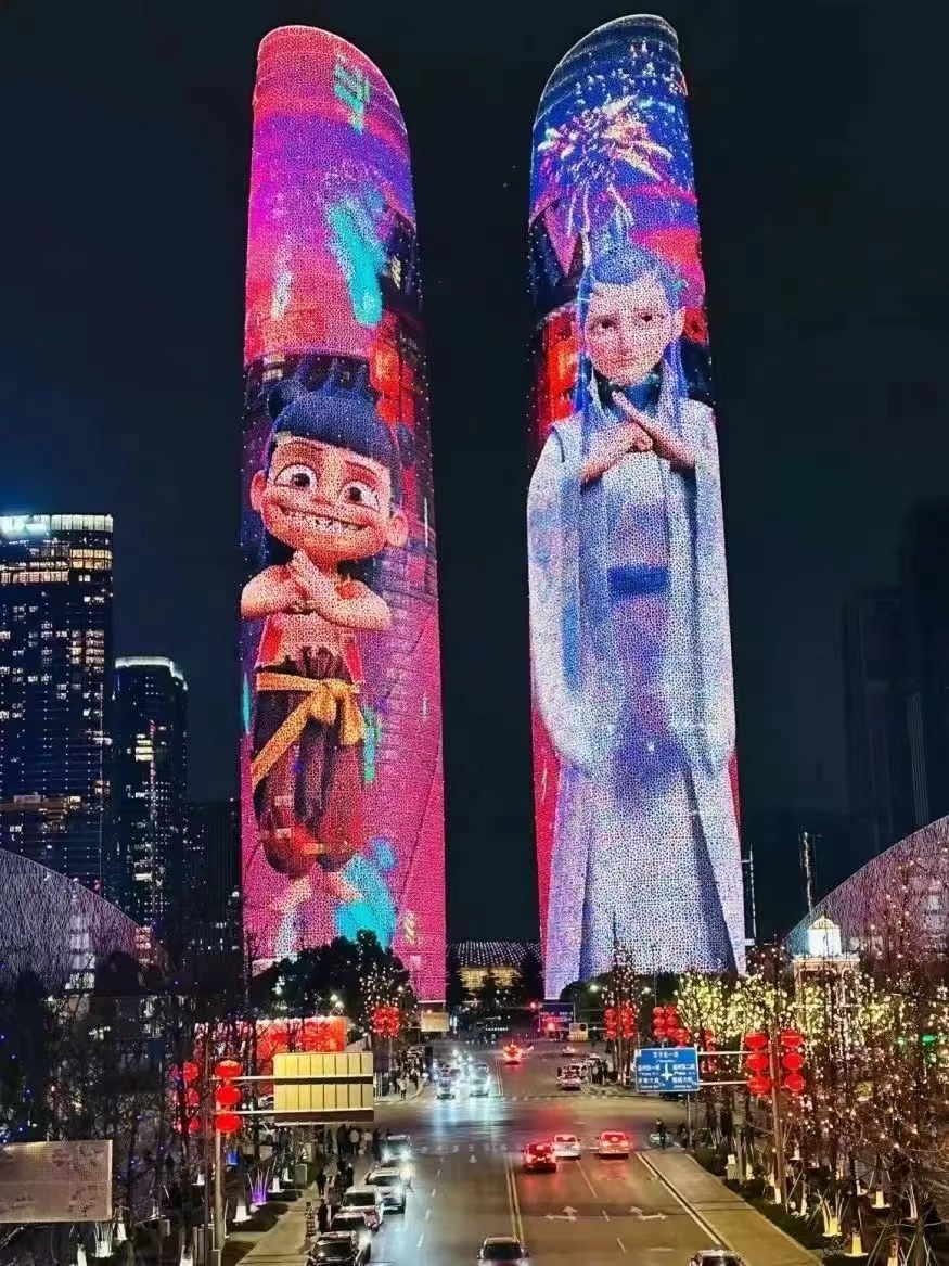哪吒和敖丙的巨型海報亮相成都雙子塔為市民送上新春祝福。成都高新區(qū)供圖